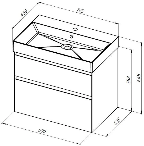Тумба комплектуется керамической раковиной SLIM SYNERGY 70. Раковина имеет прямоугольную форму, глубокую чашу и тонкий высокий бортик. Доступна в белом или черном цвете.