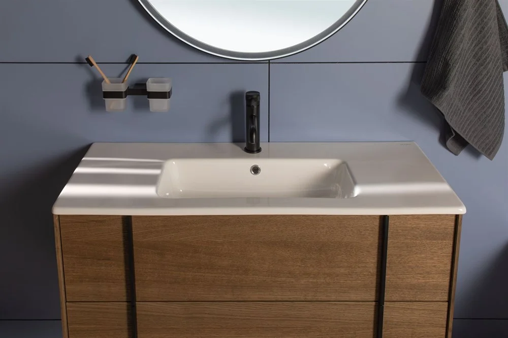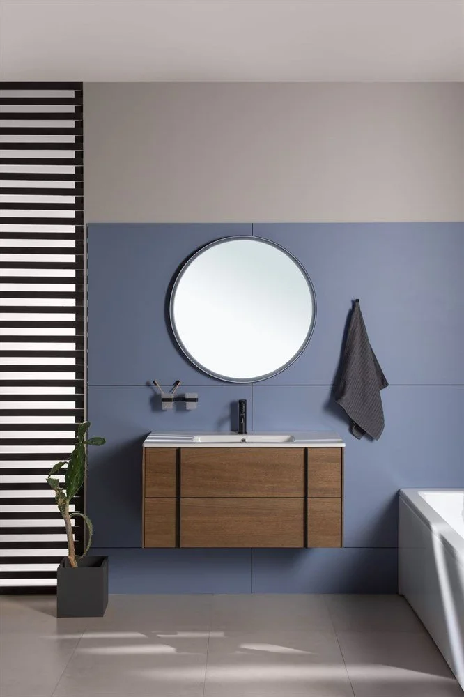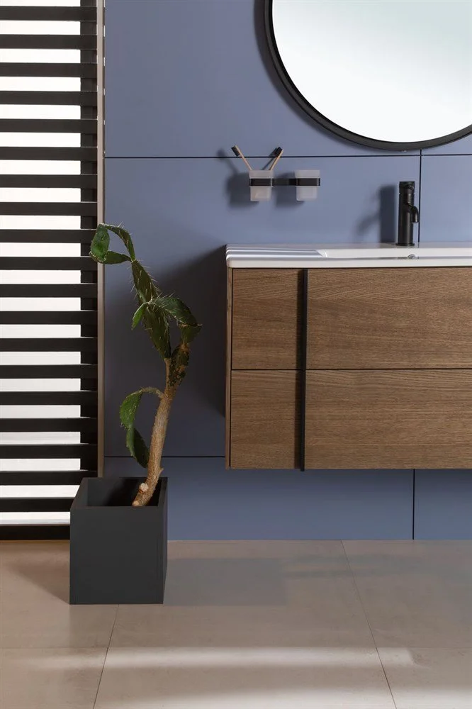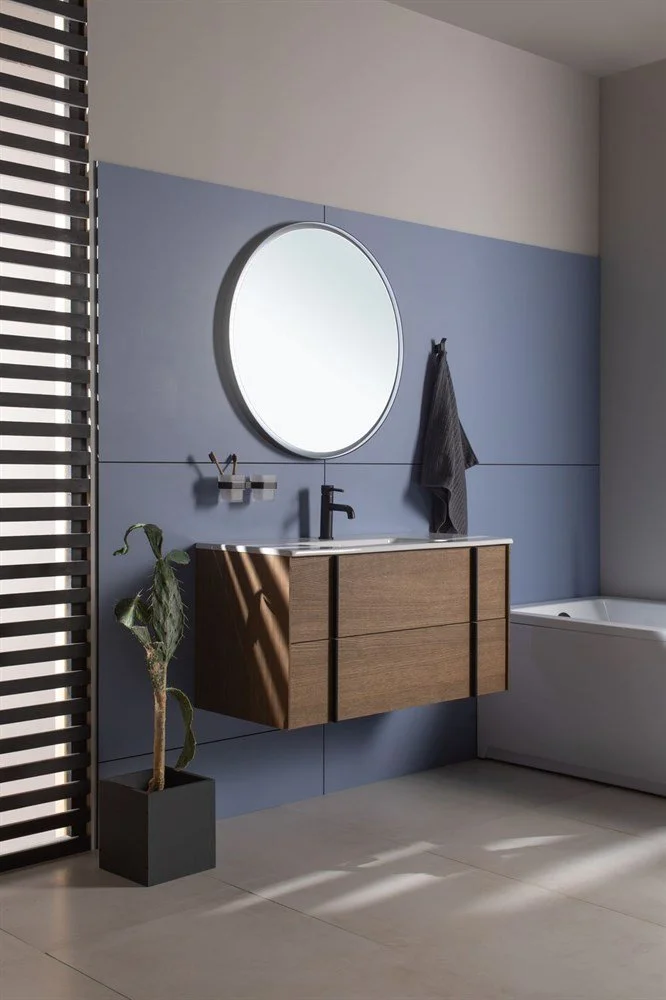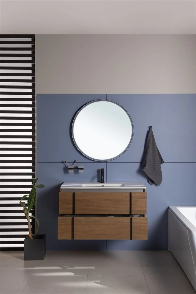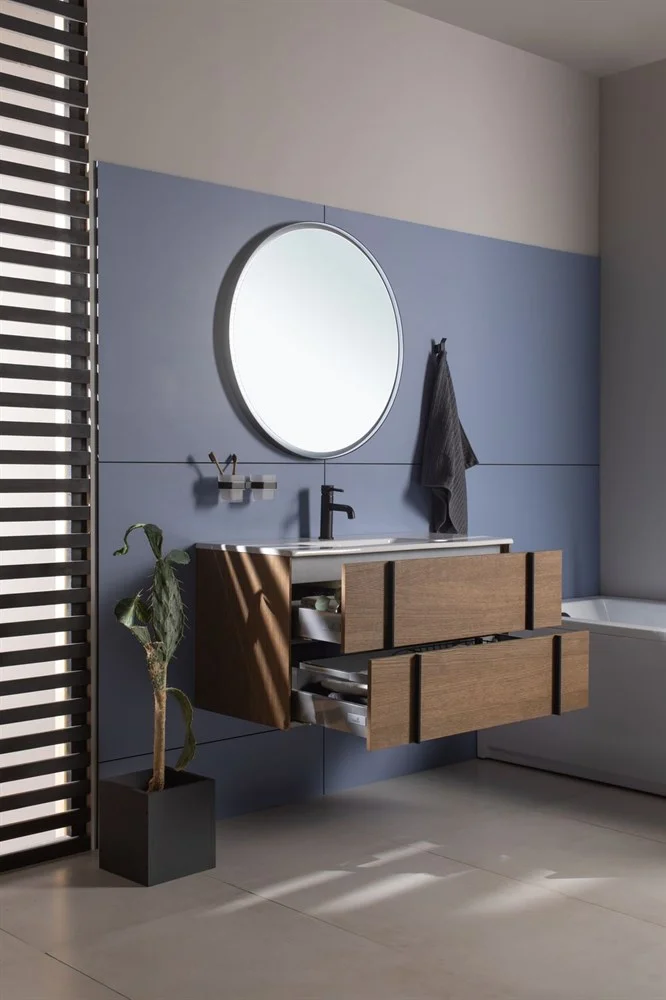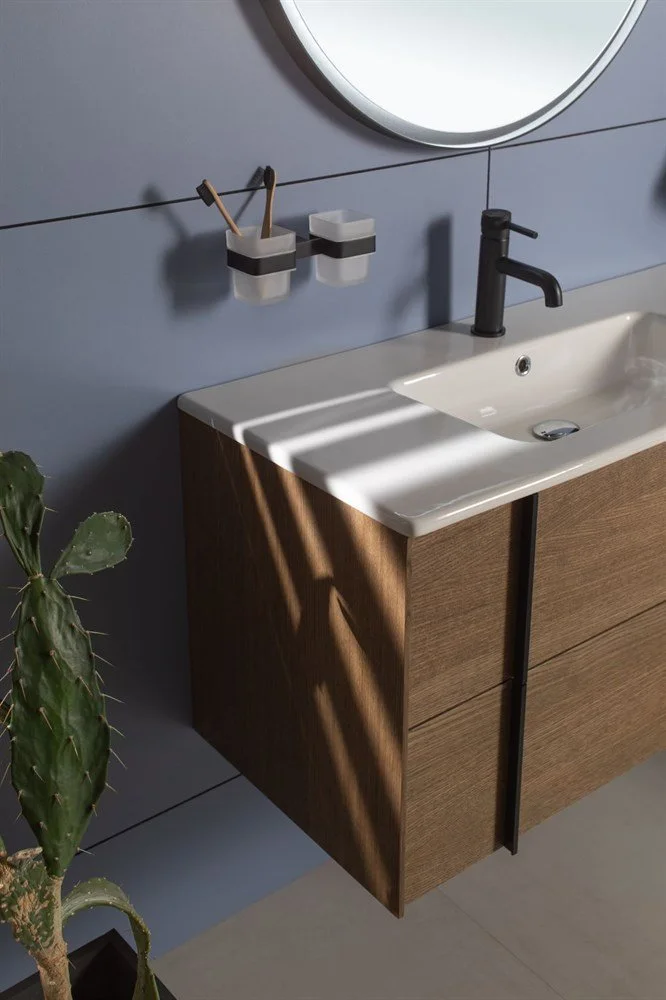 Изюминкой коллекции являются стильные и оригинальные металлические ручки, которые образуют единую линию с ножками тумбы и пенала. Ручки, опоры и зеркала коллекции REALITY выполнены из металла в цветах: черный браш или латунь браш.