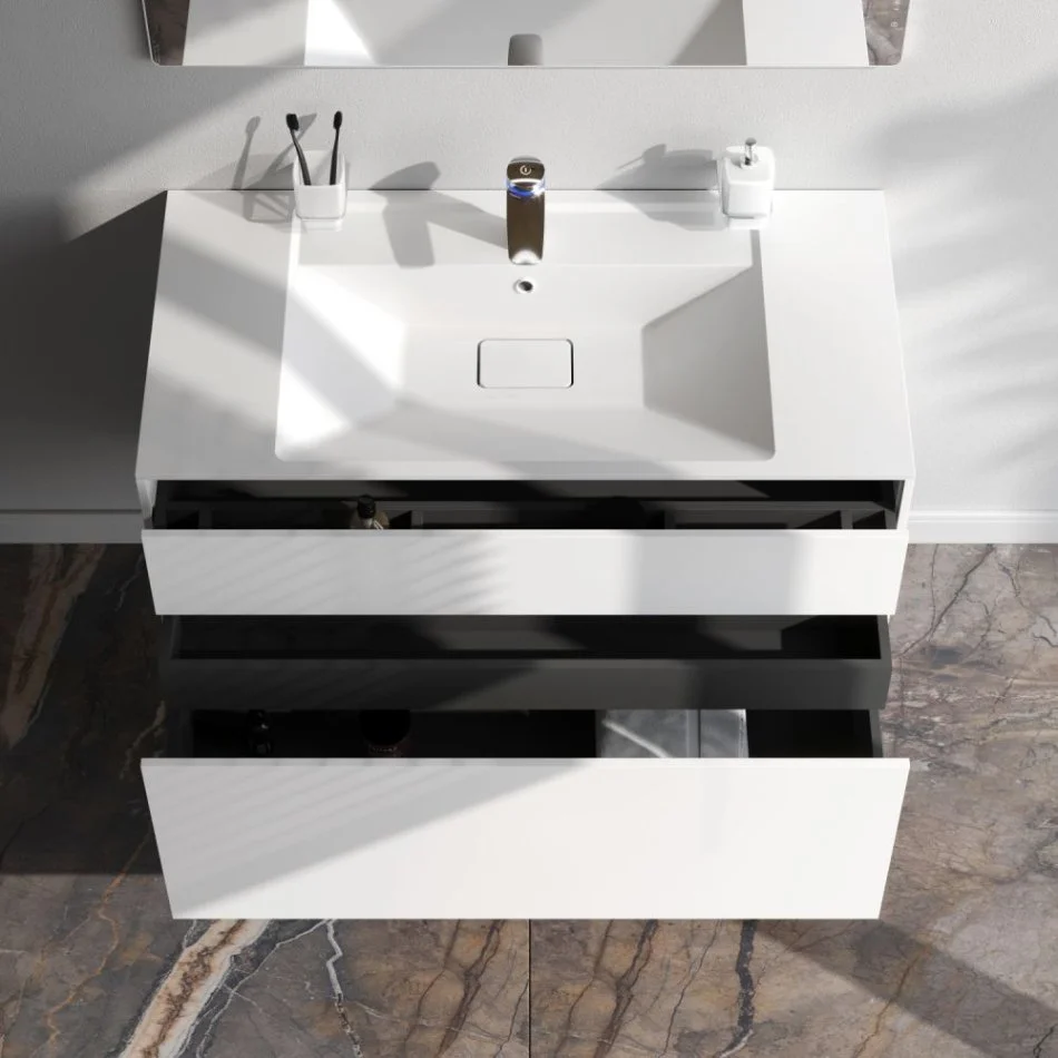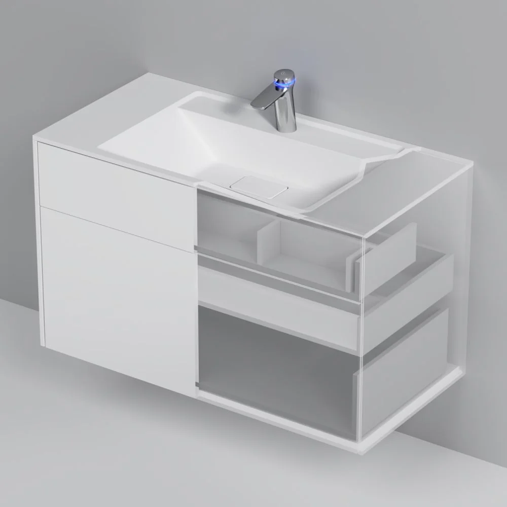 Ультратонкая раковина эргономичной формы с покрытием из мрамора идеально сочетается с мебельной базой