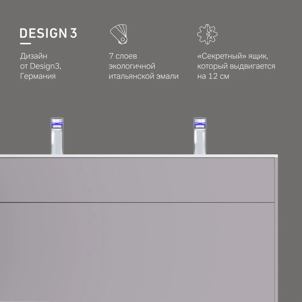Мебель Inspire V2.0 – идеальный выбор для тех кто привык к динамичному стилю жизни ценит абсолютный комфорт и минимализм в интерьере. Вариативность размеров и цветов дает неограниченные возможности для создания стильного дизайна ванной комнаты с учетом ее планировки и индивидуальных предпочтений владельца. Ультратонкая раковина эргономичной формы с покрытием из мрамора идеально сочетается с мебельной базой. Инновационный подход к хранению: теперь пространство под раковиной эффективно используется. Мы предусмотрели дополнительный ящик который выдвигается на 15 см и обеспечивает быстрый доступ к самым нужным вещам. Экологически чистые и долговечные полиакриловые эмали: специальная технология покраски в 7 слоев превосходит технологию нанесения автоэмали у ведущих немецких марок и обеспечивает насыщенный цвет в течение всего срока службы. Теперь в самых актуальных матовых оттенках. Премиальная фурнитура push-to-open от мирового производителя Blum и доводчики для мягкого плавного закрывания.