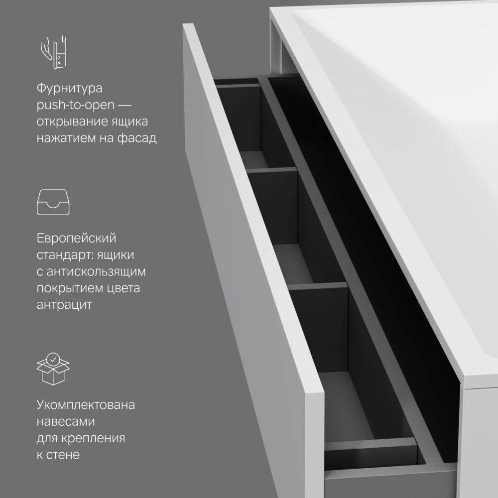 Мебель Inspire V2.0 – идеальный выбор для тех, кто привык к динамичному стилю жизни, ценит абсолютный комфорт и минимализм в интерьере. Вариативность размеров и цветов дает неограниченные возможности для создания стильного дизайна ванной комнаты с учетом ее планировки и индивидуальных предпочтений владельца. Ультратонкая раковина эргономичной формы с покрытием из мрамора идеально сочетается с мебельной базой. Инновационный подход к хранению: теперь пространство под раковиной эффективно используется. Мы предусмотрели дополнительный ящик, который выдвигается на 15 см и обеспечивает быстрый доступ к самым нужным вещам. Экологически чистые и долговечные полиакриловые эмали: специальная технология покраски в 7 слоев превосходит технологию нанесения автоэмали у ведущих немецких марок и обеспечивает насыщенный цвет в течение всего срока службы. Теперь в самых актуальных матовых оттенках. Премиальная фурнитура push-to-open от мирового производителя Blum и доводчики для мягкого плавного закрыв
