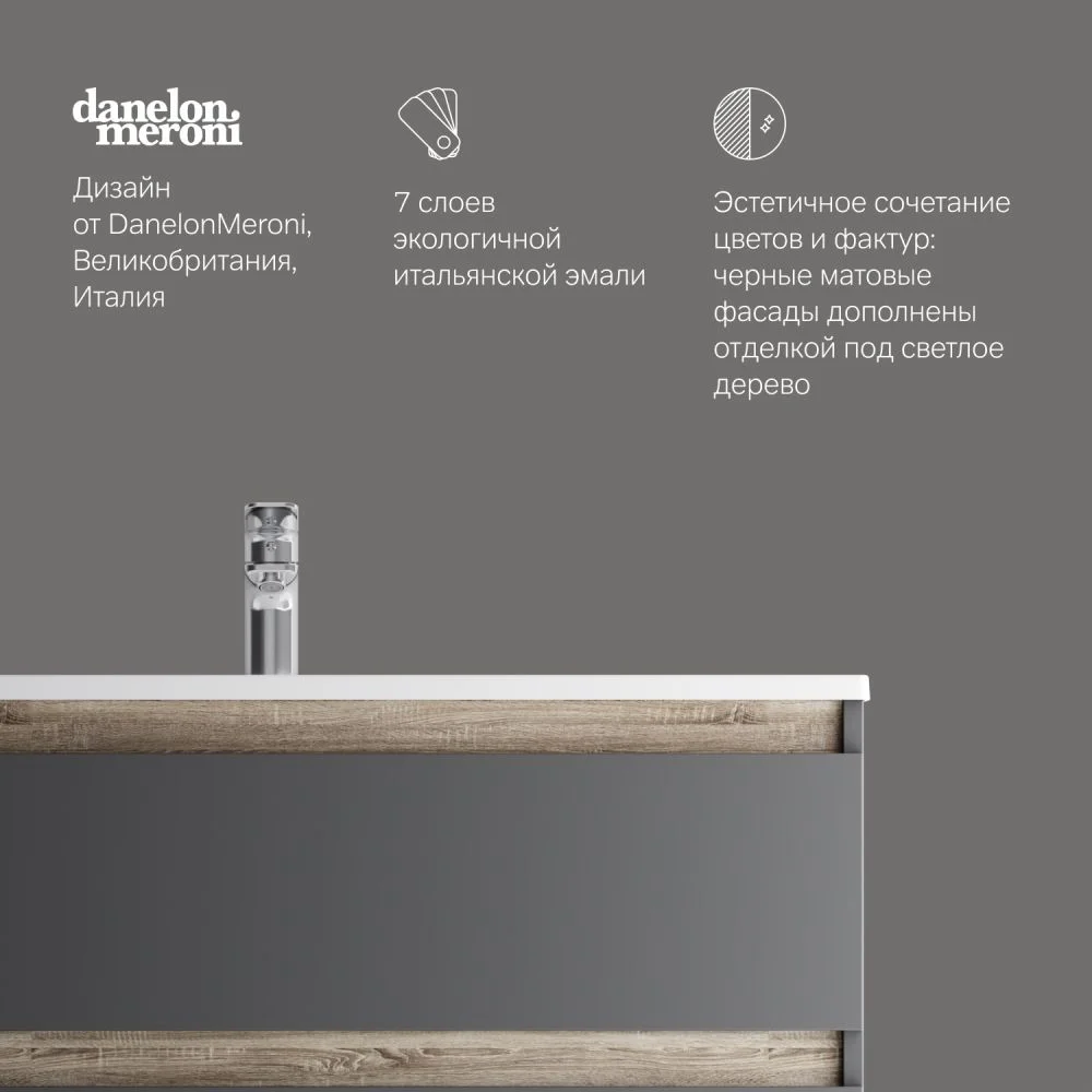 Впервые на рынке – дизайнерская коллекция сантехники которую может позволит себе каждый. Самое эстетичное сочетание цветов и фактур от дизайн-бюро Danelon Meroni (Великобритания & Италия): черные матовые фасады дополнены отделкой с фактурой под темное дерево.