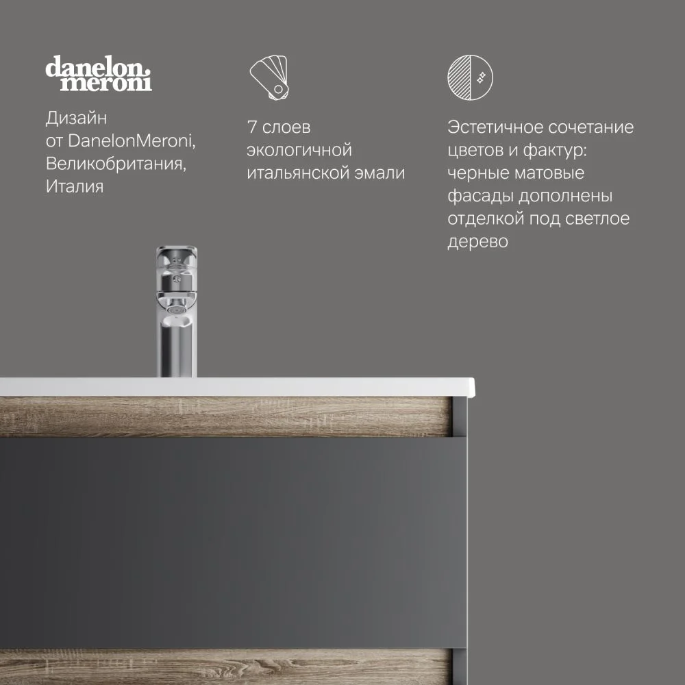Впервые на рынке – дизайнерская коллекция сантехники которую может позволит себе каждый. Самое эстетичное сочетание цветов и фактур от дизайн-бюро Danelon Meroni (Великобритания & Италия): черные матовые фасады дополнены отделкой с фактурой под темное дерево.