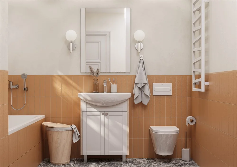 Комплект состоит из тумбы, зеркала и шкафа-колонны. В тумбе за распашными фасадами расположена регулируемая полка. Шкаф-колонна выпускается в двух вариантах: в одном случае вверху и внизу - распашные фасады, за которыми расположены регулируемые по высоте полки, во втором случае внизу вместо распашного фасада установлена бельевая корзина. Еще одна особенность колонн - возможность перевешивания распашных фасадов на противоположную сторону. Поэтому их можно использовать как в левом, так и в правом варианте.