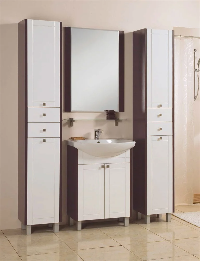 Комплект состоит из тумбы, зеркала и шкафа-колонны. В тумбе за распашными фасадами расположена регулируемая полка. Шкаф-колонна выпускается в двух вариантах: в одном случае вверху и внизу - распашные фасады, за которыми расположены регулируемые по высоте полки, во втором случае внизу вместо распашного фасада установлена бельевая корзина. Еще одна особенность колонн - возможность перевешивания распашных фасадов на противоположную сторону. Поэтому их можно использовать как в левом, так и в правом варианте.