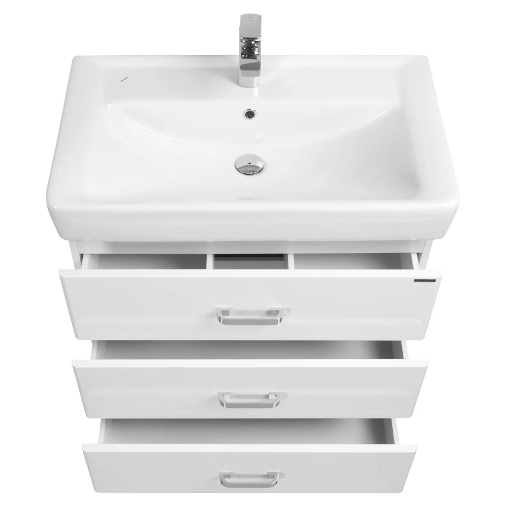В этой модификации модели уже 3 вместительных ящика и изящные глянцевые опоры. Исполнение на ножках будет удобно в тех ванных комнатах, где стены недостаточно укреплены и есть сомнение, что они выдержат подвесную мебель. Тумбы АМЕРИНА М обладают всеми преимуществами тумб АМЕРИНА: направляющие нижнего крепежа обеспечивают жесткое и надежное крепление ящиков; плавный ход ящиков; встроенные в ящики доводчики, обеспечивающие бесшумное и плавное закрывание; дополнительно организовано нижнее подключение труб водоснабжения и канализации.
