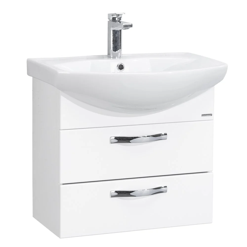 Тумба Ария 50 M в современном стиле выполнена из влагостойкой ламинированной плиты, высококачественной MDF и окрашена с высокой степенью глянца полиэфирной краской ультрафиолетового отверждения. Данный способ окрашивания обеспечивает изделию привлекательный внешний вид, а также износостойкость и долговечность. Тумба содержит два вместительных ящика и комплектуется белоснежной раковиной от бренда Santek.