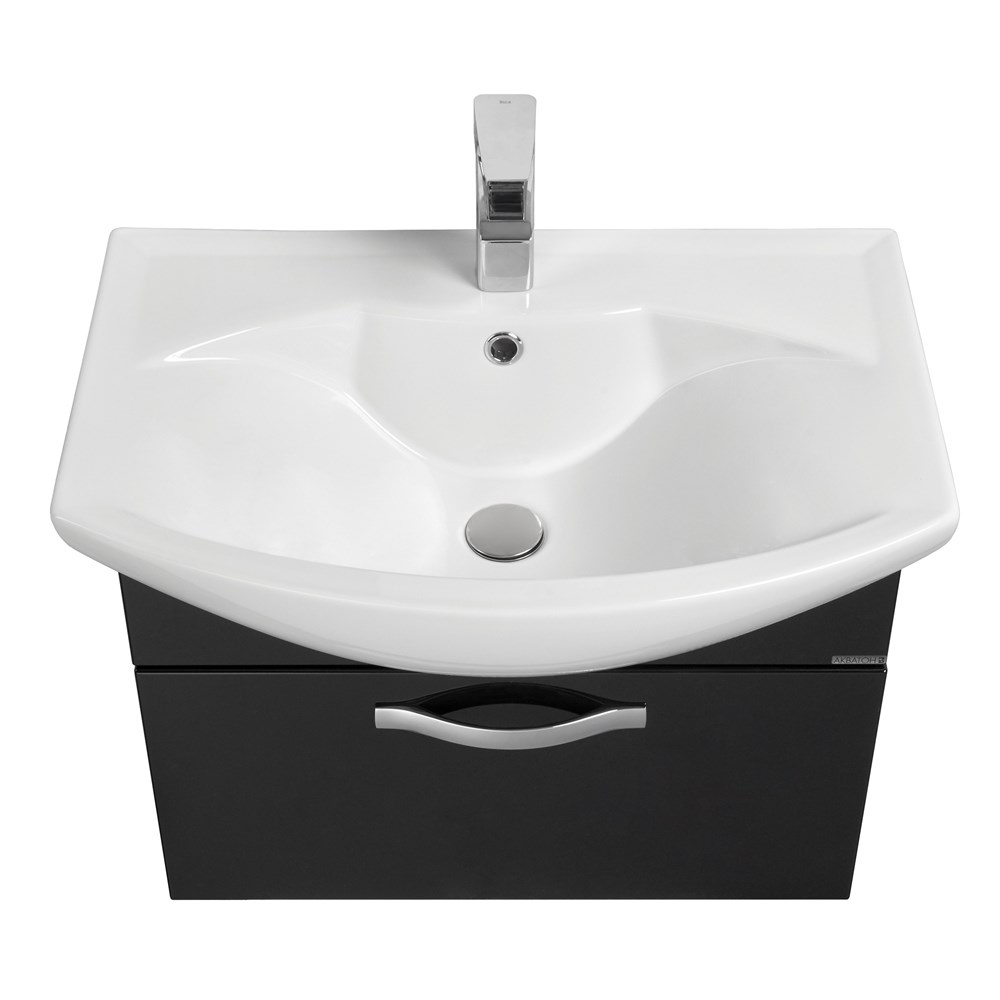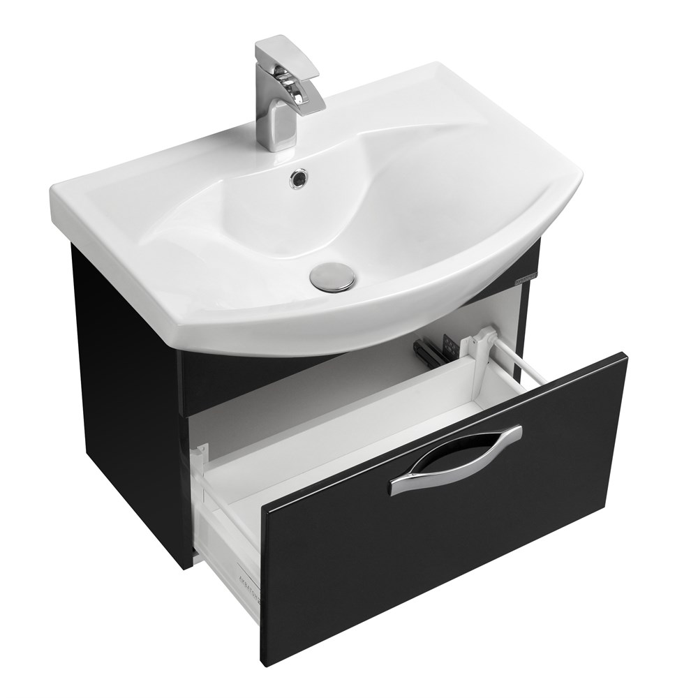 Тумба Ария 65 в современном стиле выполнена из влагостойкой ламинированной плиты, высококачественной MDF и окрашена с высокой степенью глянца полиэфирной краской ультрафиолетового отверждения. Данный способ окрашивания обеспечивает изделию привлекательный внешний вид, а также износостойкость и долговечность. Тумба содержит один ящик и комплектуется белоснежной раковиной от бренда Santek.