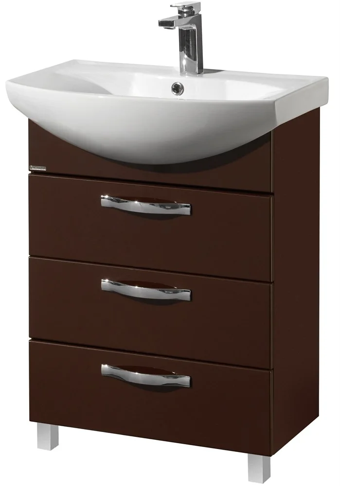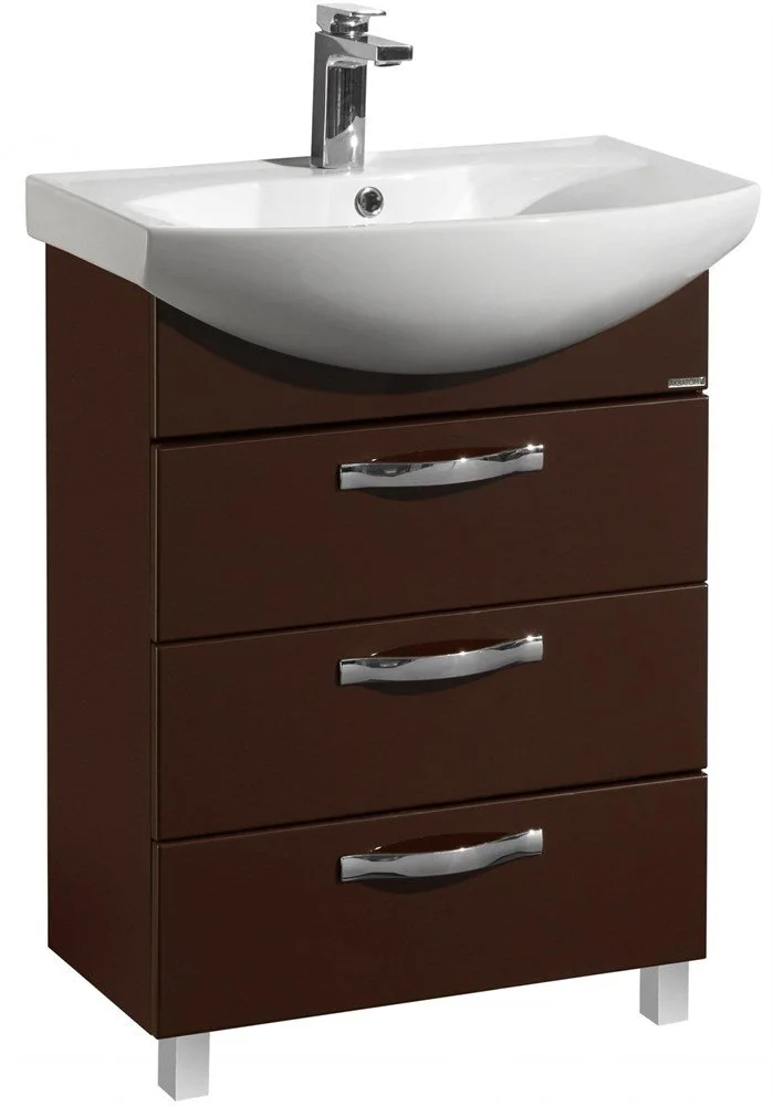 Тумба содержит три ящика и комплектуется белоснежной раковиной от бренда Santek.
