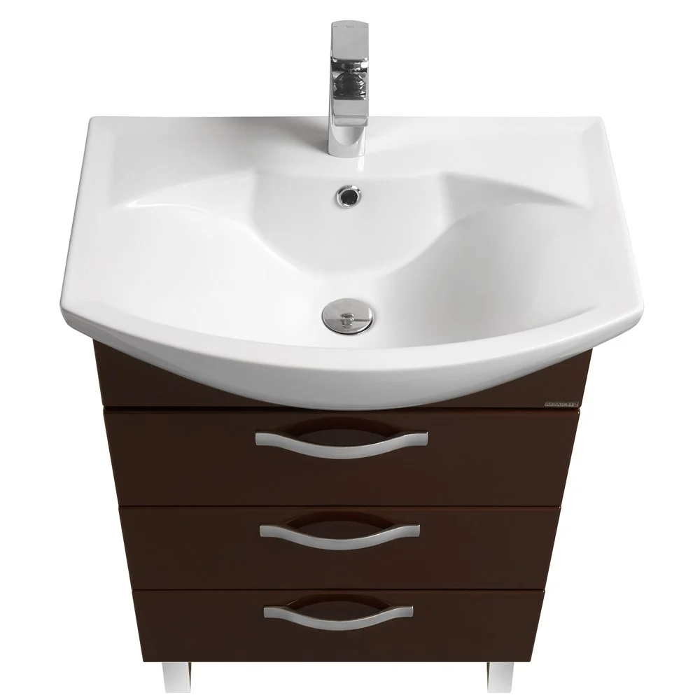 Тумба содержит три ящика и комплектуется белоснежной раковиной от бренда Santek.