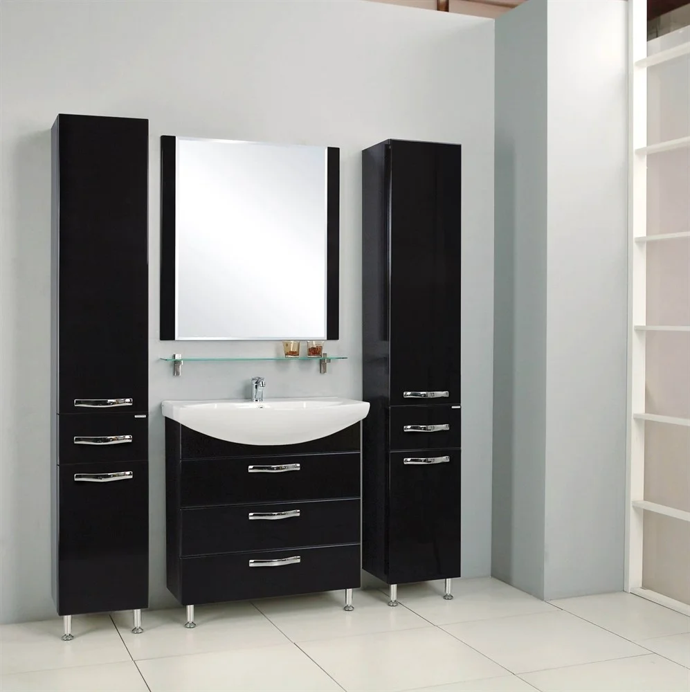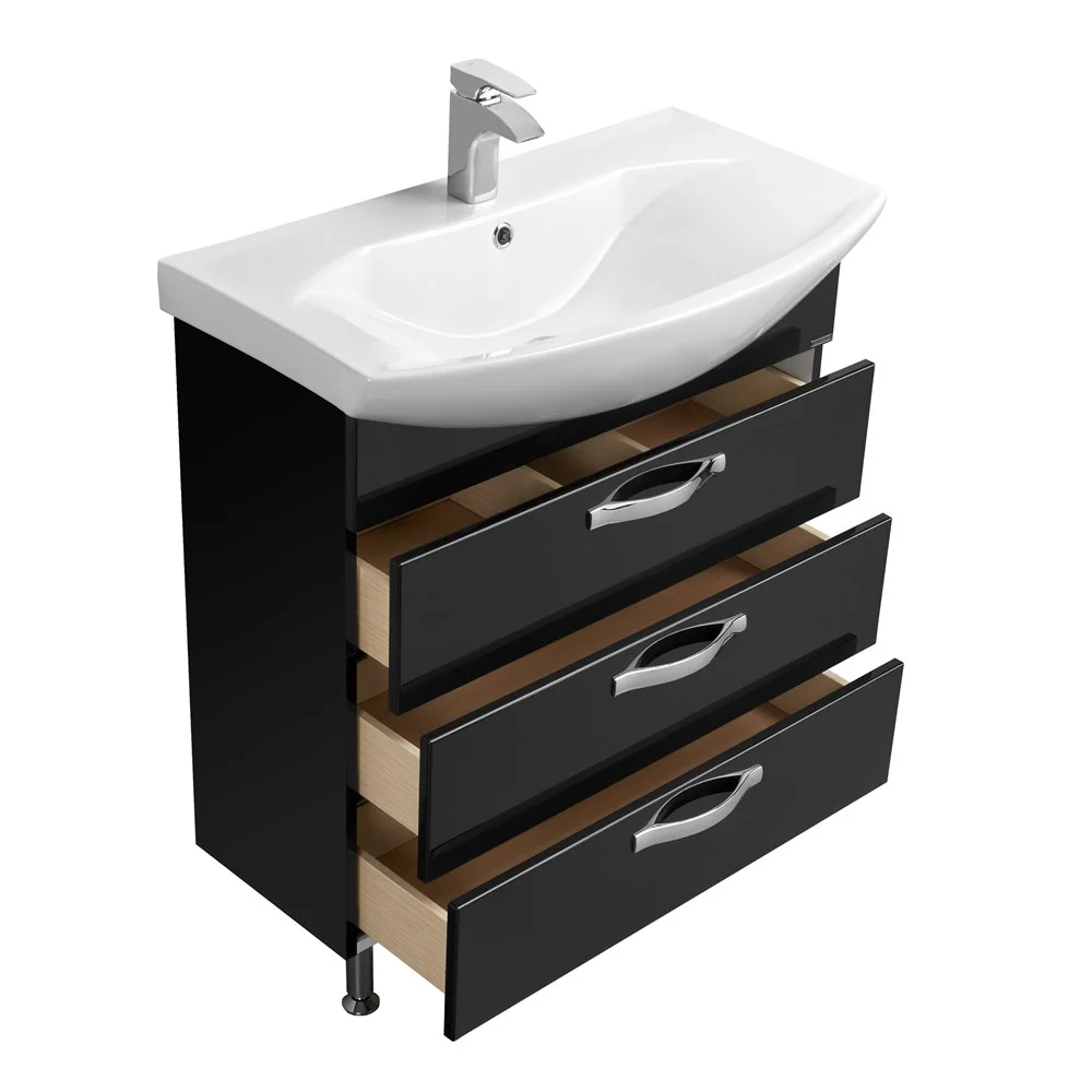 Тумба Ария 80 H в современном стиле выполнена из влагостойкой ламинированной плиты,  высококачественной MDF и окрашена с высокой степенью глянца полиэфирной краской ультрафиолетового отверждения.  Данный способ окрашивания обеспечивает изделию привлекательный внешний вид, а также износостойкость и долговечность. Тумба содержит три ящика и комплектуется белоснежной раковиной от бренда  Santek.
