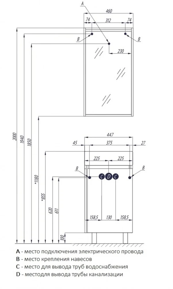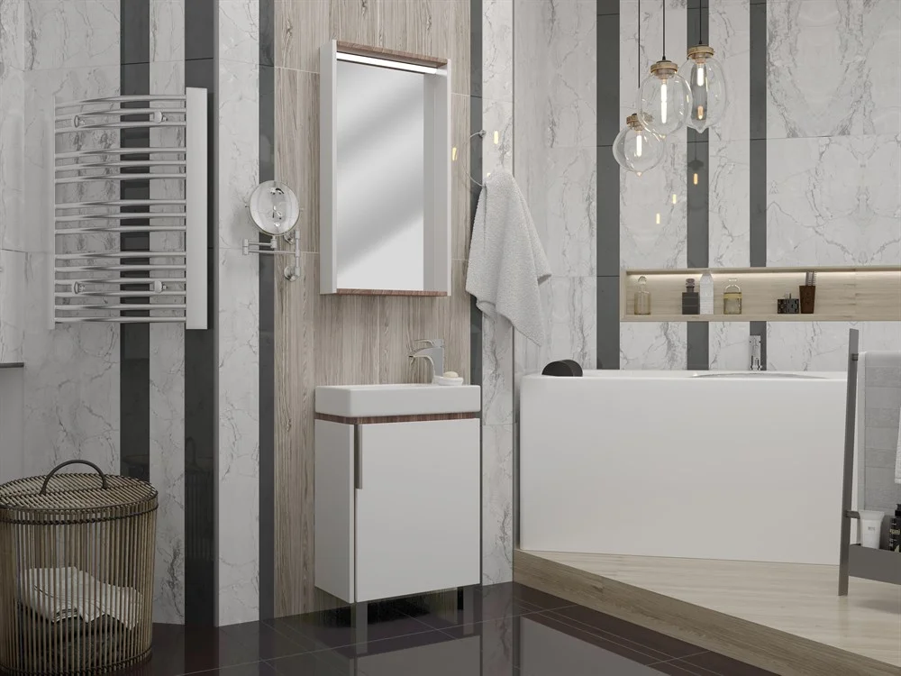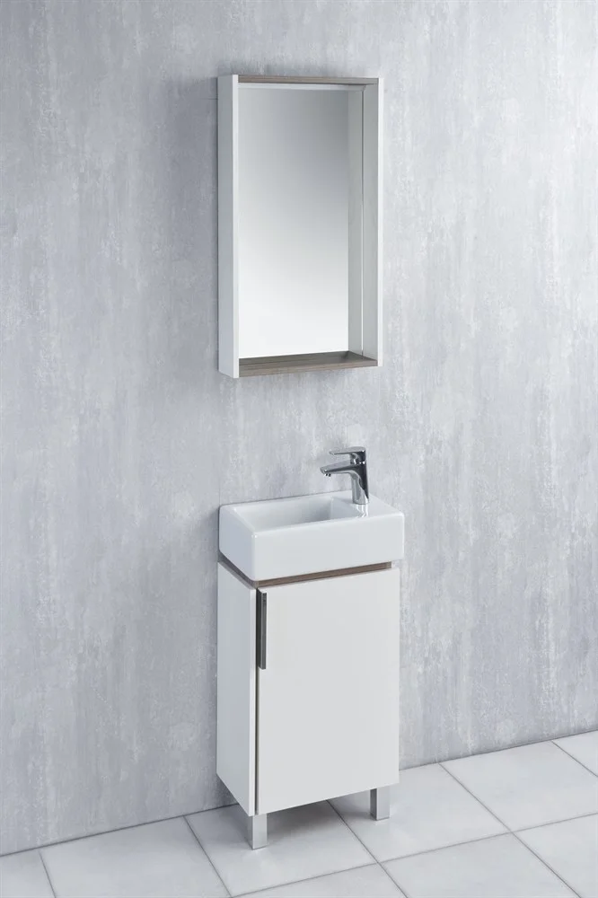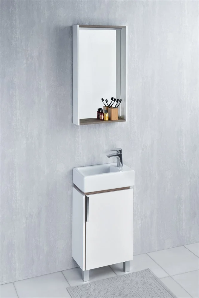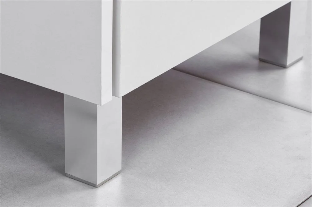 Раковина напольной тумбы Белла приподнята за счет цоколя из влагостойкой ЛДСП цвета «джарра».