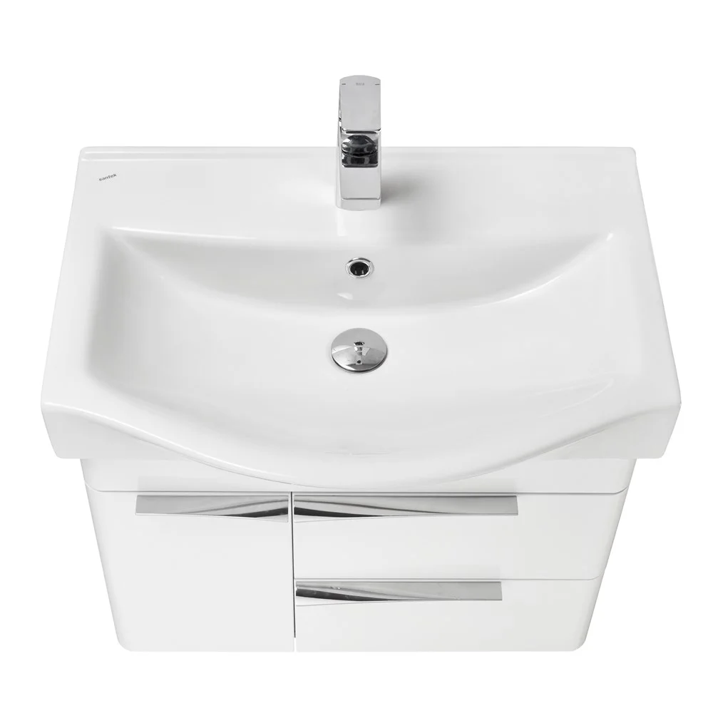 Тумба Беверли в современном стиле, выполненная из влагостойкой ламинированной плиты и высококачественной MDF, обладает удобным функционалом. Слева за распашным фасадом-створкой находится вместительная ниша с регулируемой полкой из влагостойкой ламинированной плиты, а справа размещены два ящика, в которых поместятся необходимые в ванной комнате принадлежности. Петли снабжены доводчиками, а ящики – интегрированной системой плавного закрывания для комфорта и удобства потребителя. Изящные ручки в цвете глянцевый хром идеально сочетаются с линиями белоснежной керамической раковины Беверли бренда Santek. Тумба окрашена в белый цвет с высокой степенью глянца, что обеспечивает изделию привлекательный внешний вид, а также износостойкость и долговечность.