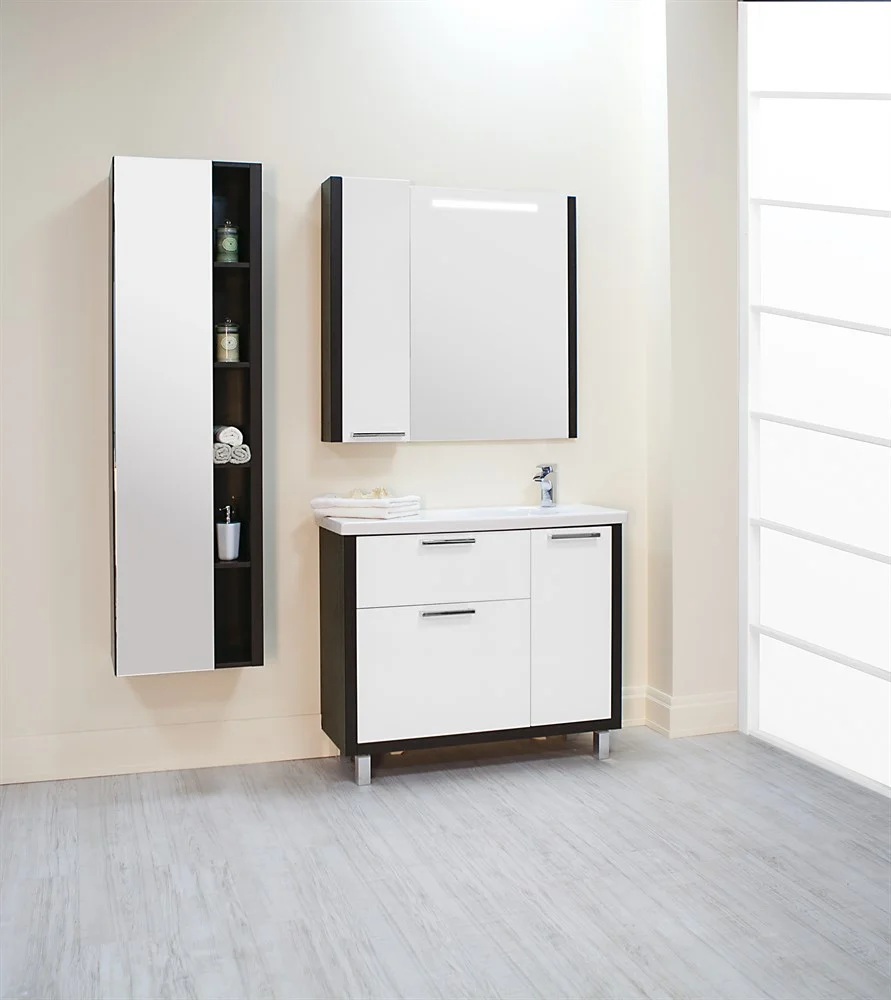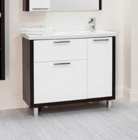Прямоугольная тумба Брайтон 100 размером 97х71,8х37,2 см имеет напольный тип установки на четыре хромированные ножки. Модель 1A1771K0BR500 от производителя Акватон выполнена в двух цветах – «венге» (корпус) и белый (фасад). Изделие оборудовано одним выдвижным ящиком и расположенной под ним откидной дверкой, рядом с которыми находится отсек с корзиной для белья.