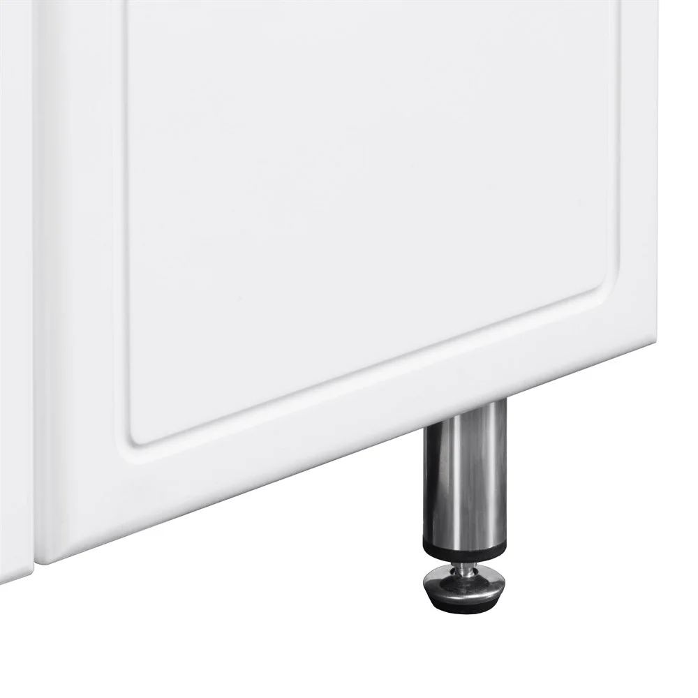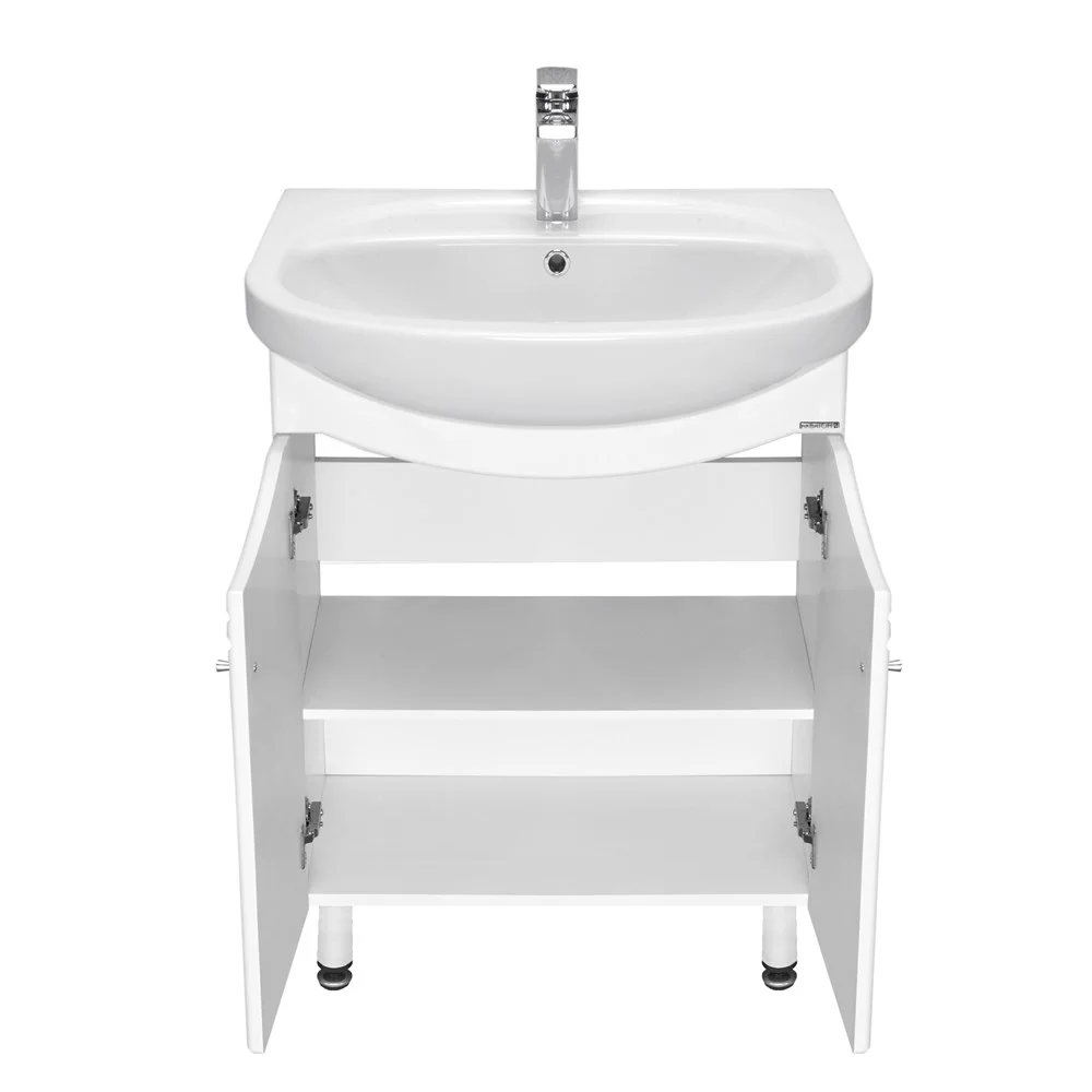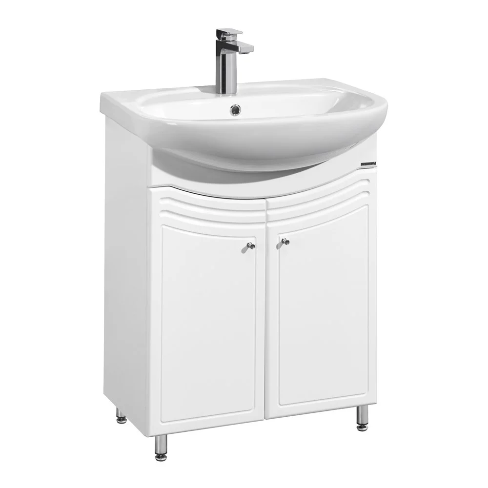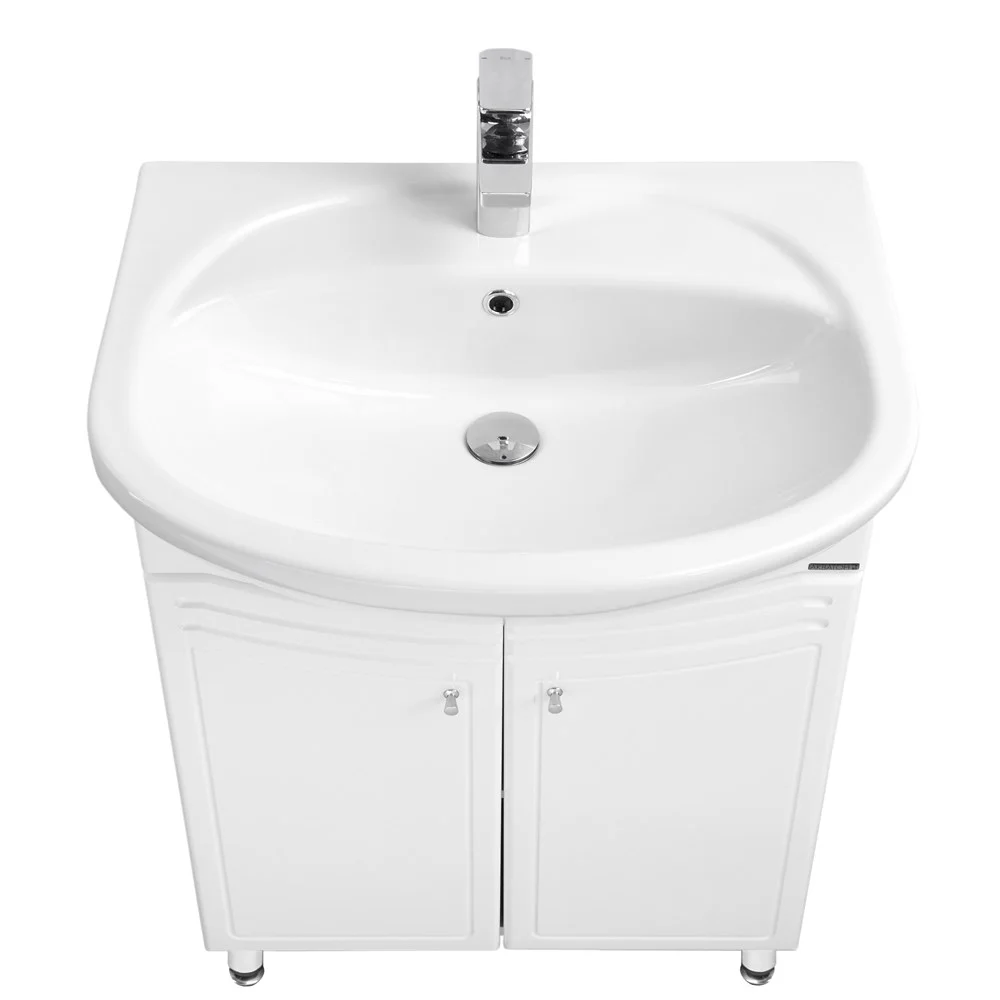 Модель выполнена в традиционном стиле - строгий лаконичный дизайн и ничего лишнего. В тумбе, которая установлена на регулируемые ножки, за распашными фасадами установлена полка, высоту расположения которой можно менять. Зеркало снабжено шкафчиком для мелких предметов и верхней панелью с подсветкой. Дополнительный функционал обеспечивает шкаф-колонна - вверху распашной фасад с регулируемыми по высоте полками, в центре два ящика, а внизу - удобная бельевая корзина.