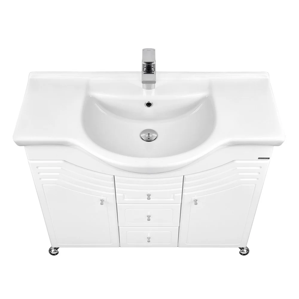 Большая удобная модель, выполненная в традиционном стиле. В тумбе, комплектуемой керамической раковиной, слева и справа - по распашному фасаду, а в центре сверху расположен откидной фасад с небольшой нишей, под которым - два удобных ящика. Зеркало с гравировкой оснащено подсветкой и шкафчиком, который может быть расположен справа или слева. Расширить функциональные возможности ком- плекта можно при помощи шкафа-колонны - вверху установлен распашной фасад с регулируемыми по высоте полками, в центре два ящика, а внизу - удобная бельевая корзина.
