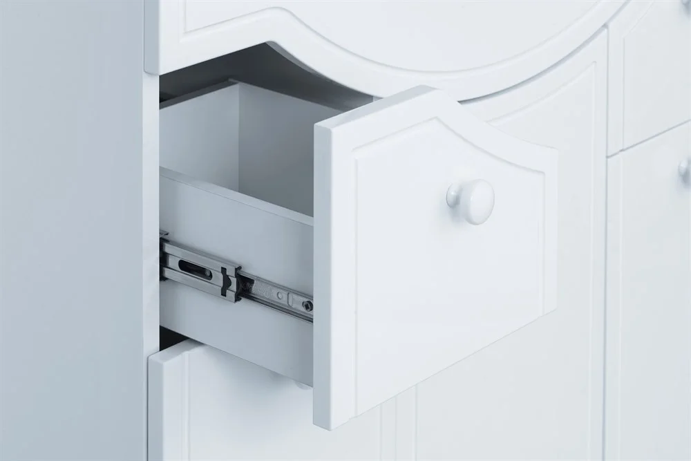 Благодаря лаконичным и эргономичным белым ручкам мебель универсальна и гармонично впишется в любую ванную комнату.
