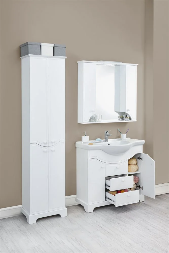 Благодаря лаконичным и эргономичным белым ручкам мебель универсальна и гармонично впишется в любую ванную комнату.