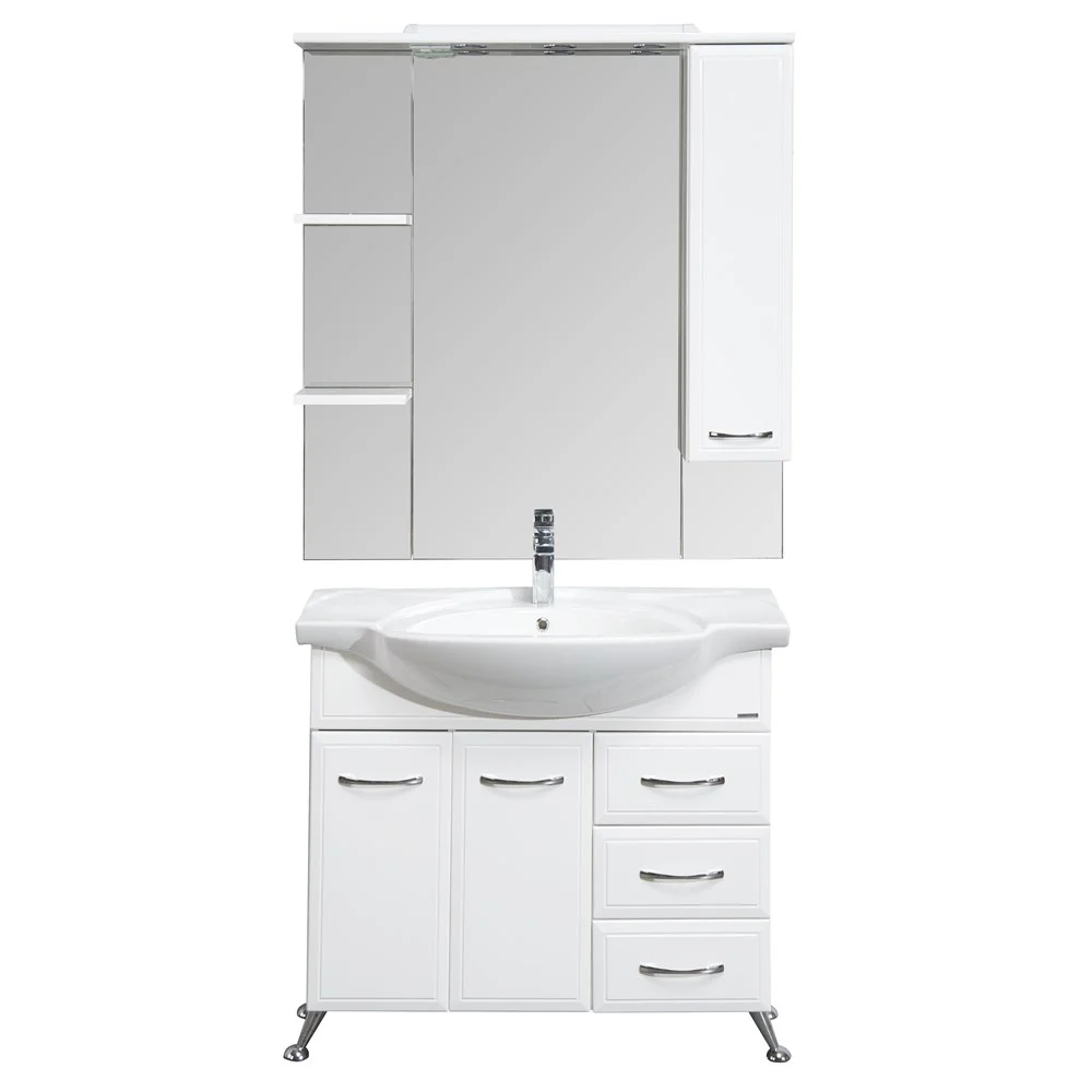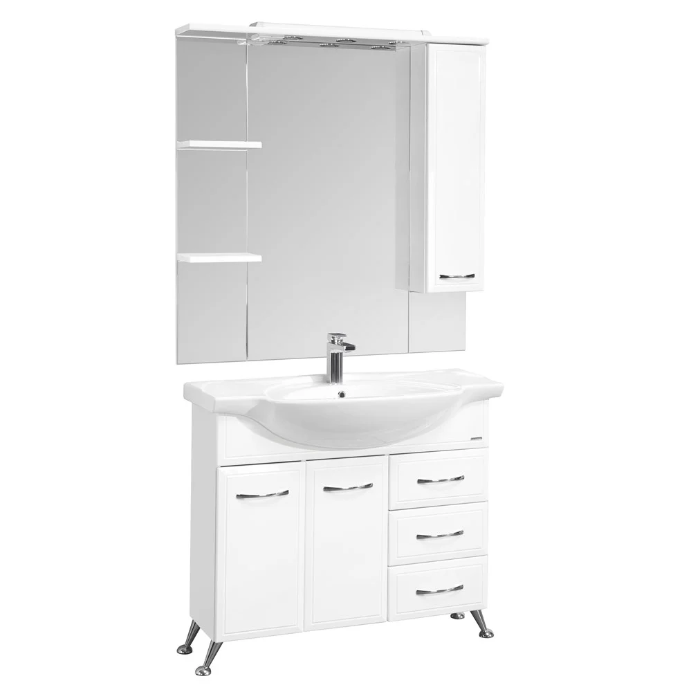 Эта модель разработана специально для обладателей большой ванной комнаты. В тумбе справа расположены три ящика, в центре за распашным фасадом - регулируемая по высоте полка, а слева - вместительная бельевая корзина. Открытые полочки на зеркале и удобный шкафчик позволят разместить все мелочи, которые всегда должны быть под рукой. В коллекцию так же входит функциональный шкаф-колонна, который выпускается в двух вариантах - в одном случае вверху и внизу расположены ниши с регулируемыми по высоте полками, а в другом - снизу вместо полок установлена бельевая корзина. В обоих вариантах распашные фасады могут быть самостоятельно установлены как на левую, так и на правую стенки шкафа.