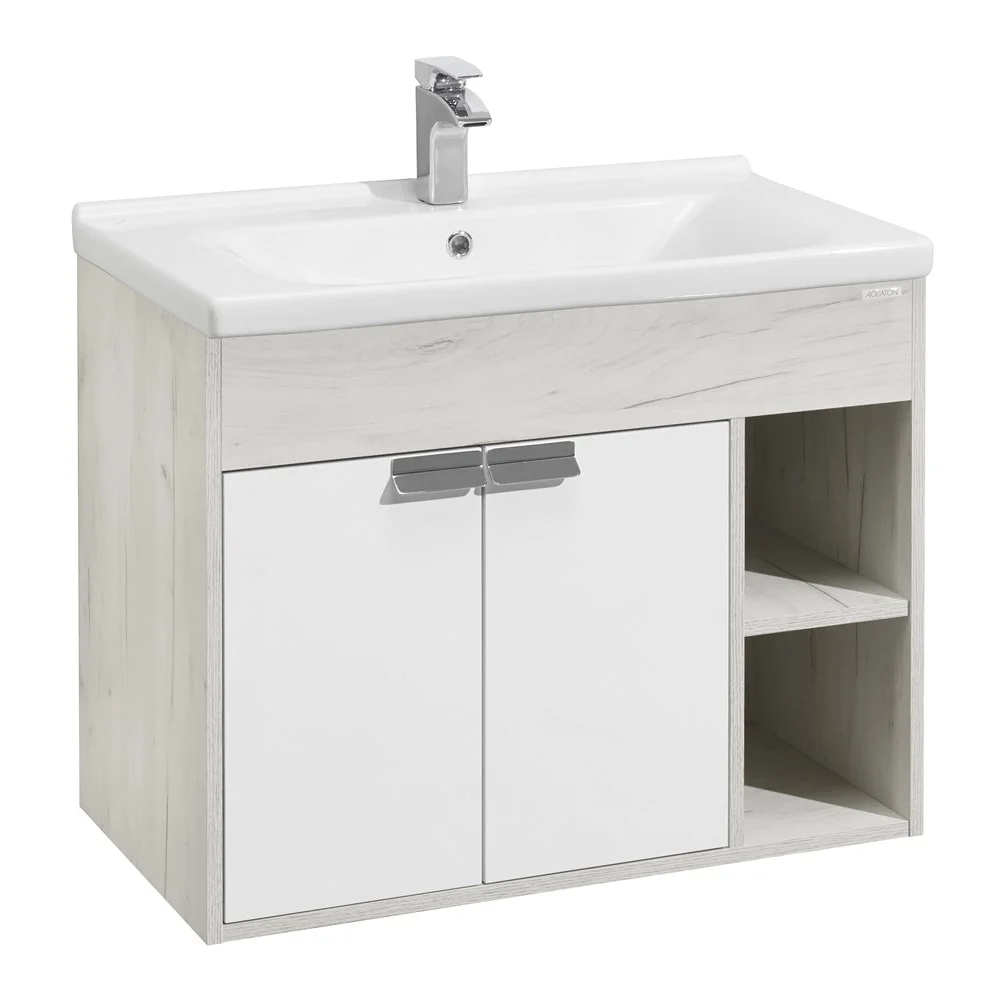Тумба Флай 80 в современном стиле сочетает в себе два цвета - белоснежный глянец и трендовый декор дуб крафт. Выполненная из влагостойкой ламинированной плиты тумба обладает простым и удобным функционалом - слева за распашными фасадами-створками находится вместительное отделение с регулируемой по высоте полкой в цвете дуб крафт, а справа - две открытые ниши, на которых так приятно разместить красивые мелочи и декор для ванной комнаты. Фасады открываются с помощью изящной и оригинальной ручки от европейского производителя (Испания), петли снабжены доводчиками. Тумба комплектуется белоснежной прямоугольной керамической раковиной Миранда бренда Santek. Фасады тумбы окрашены полиэфирной краской ультрафиолетового отверждения. Такой способ окрашивания обеспечивает изделию привлекательный внешний вид, а также износостойкость и долговечность.