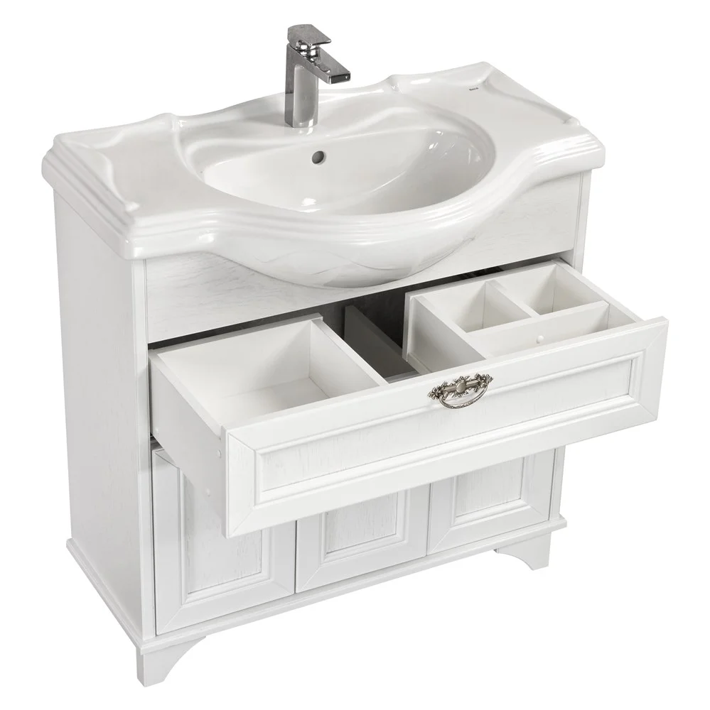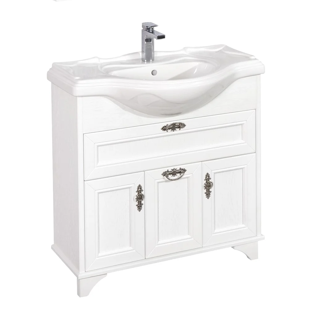Тумба коллекции Идель выполнена в классическом стиле с элементами массива дерева. Благородный светлый цвет и изящная фурнитура подарит обладателям коллекции Идель ощущение роскоши, уюта и респектабельности. Удобный функционал, состоящий из вместительного выдвижного ящика с организацией пространства и дверок, позволяет разместить и содержать все необходимые предметы в идеальном порядке.