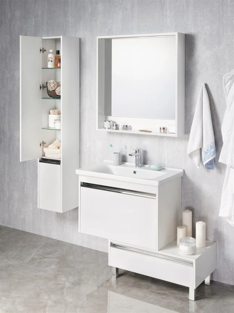 в зеркалах и зеркальных шкафах, актуальные цветовые решения и качественную фурнитуру. Коллекция выполнена в двух популярных размерах 600 мм и 800 мм. В размере 600 мм к тумбе предлагается зеркальный шкафчик, а в размере 800 мм - зеркало.