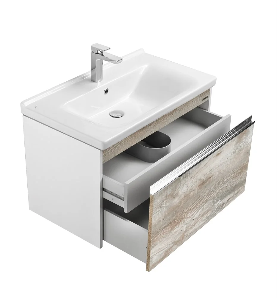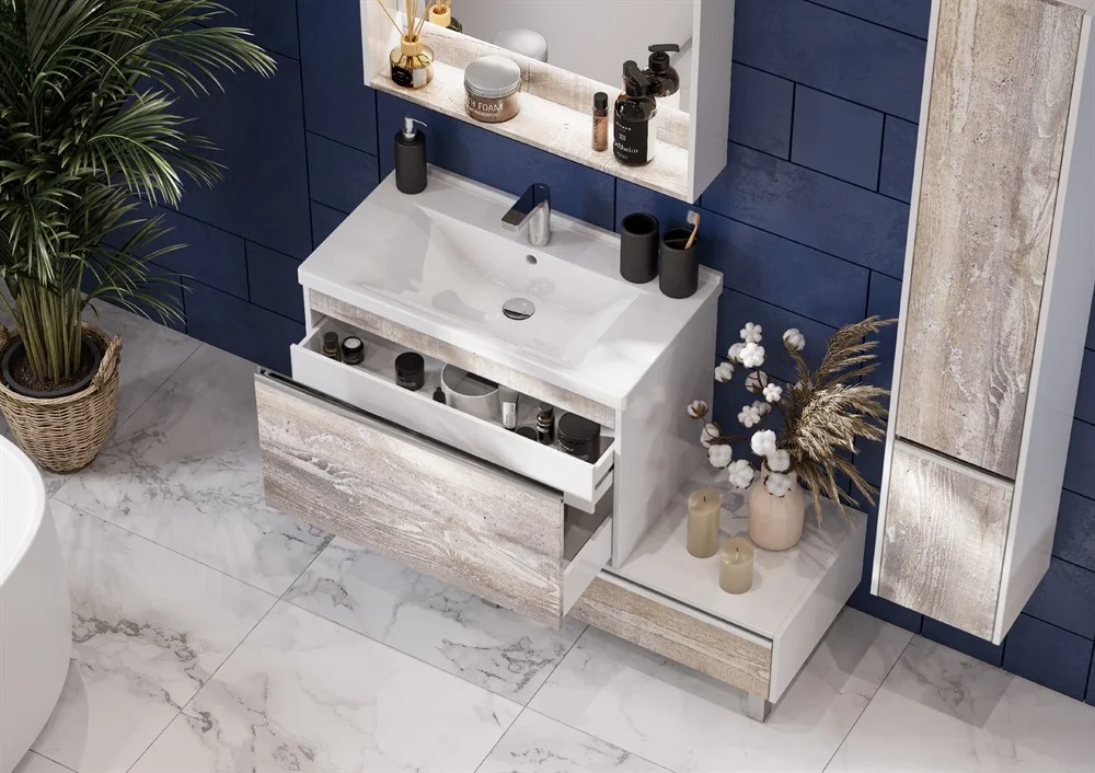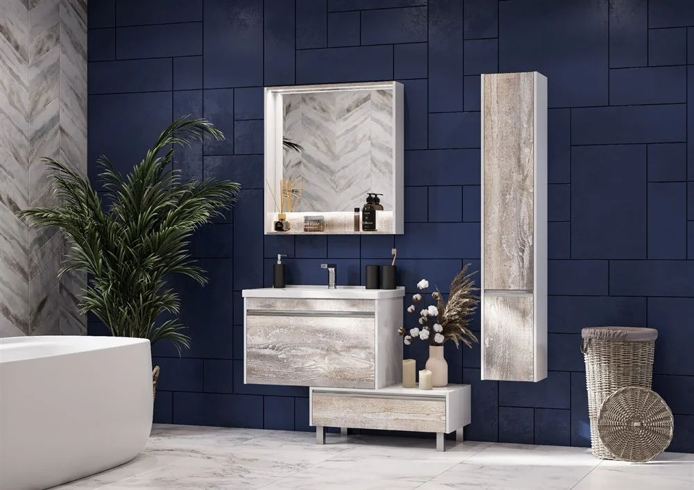 Коллекция выполнена в двух популярных размерах 600 мм и 800 мм. В размере 600 мм к тумбе предлагается зеркальный шкафчик, а в размере 800 мм - зеркало.