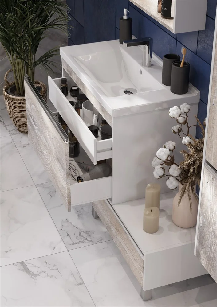 Коллекция Капри сочетает в себе современные тенденции мебели для ванных комнат: удобные профильные ручки, интегрированные в фасад, светодиодную подсветку