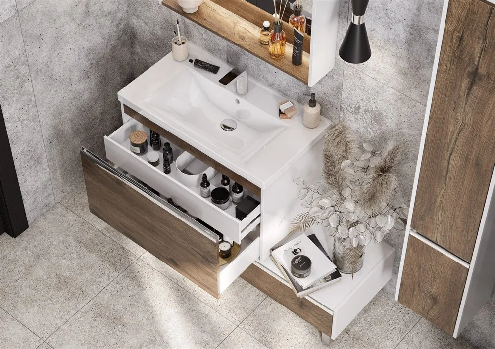 Коллекция Капри сочетает в себе современные тенденции мебели для ванных комнат: удобные профильные ручки, интегрированные в фасад, светодиодную подсветку