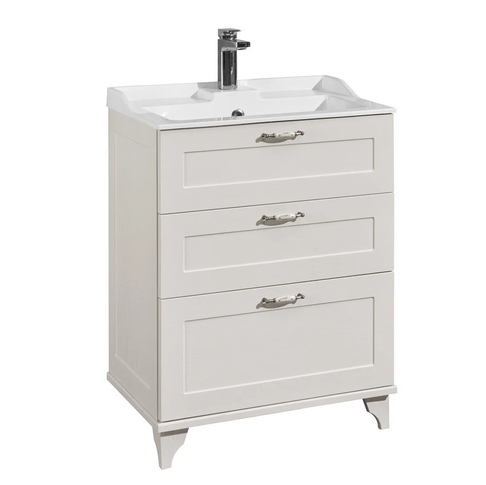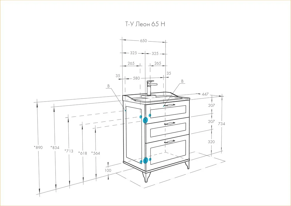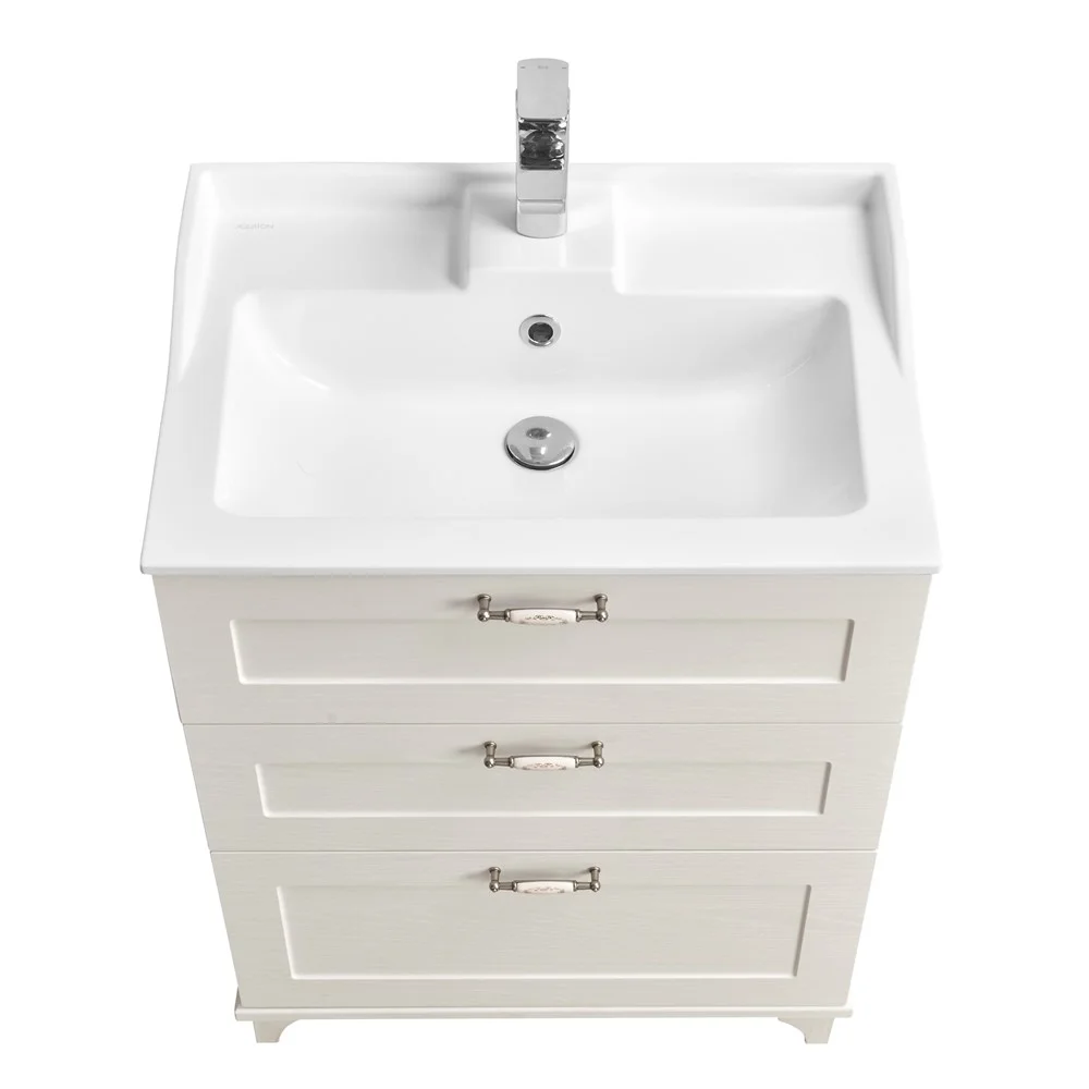 Модель ЛЕОН с шириной раковины 65 см доступна и в напольном исполнении. Тумба дополнительно снабжена надежными мебельными навесами. В тумбе установлены 3 ящика, и, помимо стандартного подключения водоснабжения и канализации (из стены), предусмотрена возможность подключения труб снизу. Тумба комплектуется раковиной из литого мрамора собственного производства АКВАТОН. Изящные формы, пристенные бортики и площадки делают ее очень удобной. На изящной полочке зеркала можно разместить мелочи, которые всегда должны быть под рукой.