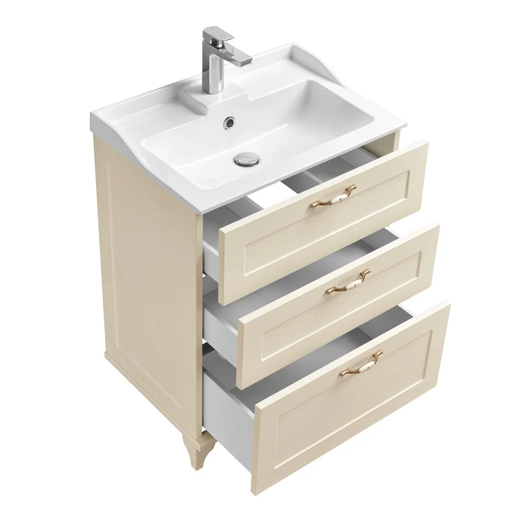 Модель ЛЕОН с шириной раковины 65 см доступна и в напольном исполнении. Тумба дополнительно снабжена надежными мебельными навесами. В тумбе установлены 3 ящика, и, помимо стандартного подключения водоснабжения и канализации (из стены), предусмотрена возможность подключения труб снизу. Тумба комплектуется раковиной из литого мрамора собственного производства АКВАТОН. Изящные формы, пристенные бортики и площадки делают ее очень удобной. На изящной полочке зеркала можно разместить мелочи, которые всегда должны быть под рукой.