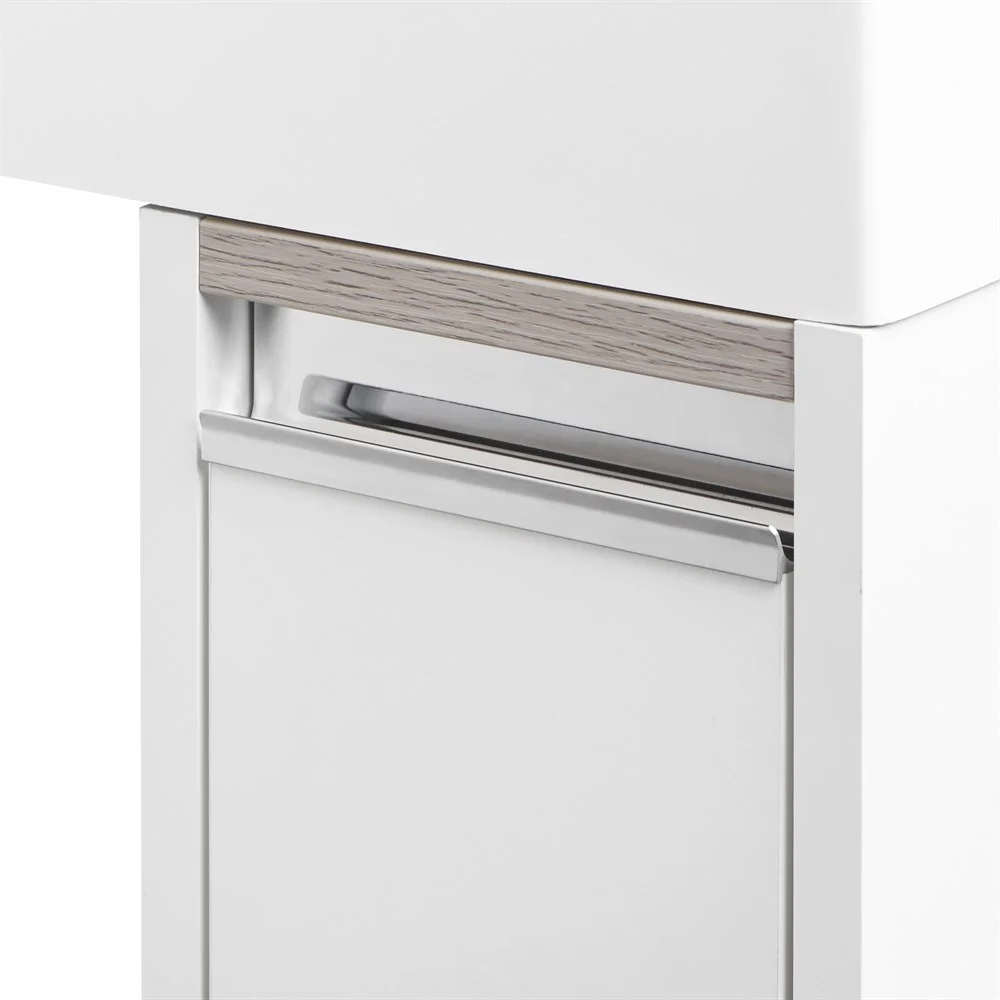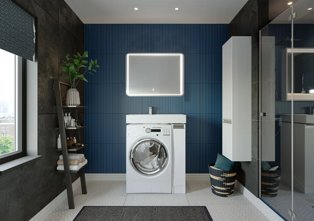 Тумба Лондри под стиральную машину выполнена из влагостойкой ламинированной плиты и окрашена в белоснежный цвет с высокой степенью глянца полиэфирной краской ультрафиолетового отверждения. Данный способ окрашивания обеспечивает изделию привлекательный внешний вид, а также износостойкость и долговечность. Ящик открывается с помощью изящной профильной хромированной ручки и состоит из двух отделений: верхнего и нижнего. Каждое отделение ящика выдерживает нагрузку до 20 кг. Над ручкой установлена вставка из влагостойкой ламинированной плиты благородного цвета дуб наварра. Тумба комплектуется раковиной Рейн 80 из прочного литого мрамора. Компактный размер данного комплекта подойдет для небольших ванных комнат и обеспечит место для хранения необходимых предметов и аксессуаров. Дополнительно к тумбе можно приобрести шкаф-колонну Лондри и зеркало c LED-подсветкой Соул 80.