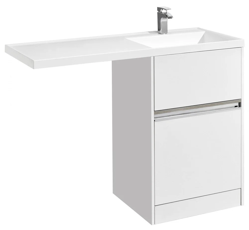 Тумба Лондри под стиральную машину выполнена из влагостойкой ламинированной плиты и окрашена в белоснежный цвет с высокой степенью глянца полиэфирной краской ультрафиолетового отверждения.