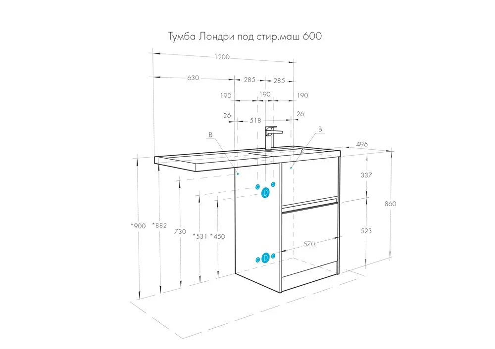 Тумба комплектуется раковиной Лондри 120 из прочного литого мрамора, который устойчив к воздействию химических средств.