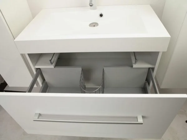 Центром коллекции является тумба с удобной раковиной из литого мрамора. Тумба выпускается с выдвижным ящиком, оснащенным системой плавного закрывания и антискользящим ковриком. Зеркальный шкаф, внутри которого расположены стеклянные полочки, оснащен подсветкой. Облегченный вариант комплектации - зеркало с подсветкой ОТЕЛЬ 80, защищено системой против запотевания ANTI-STEAM.