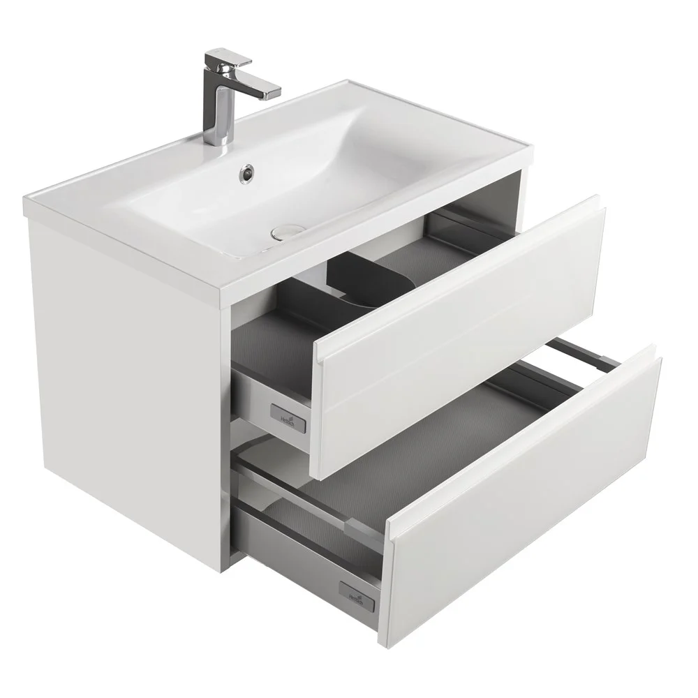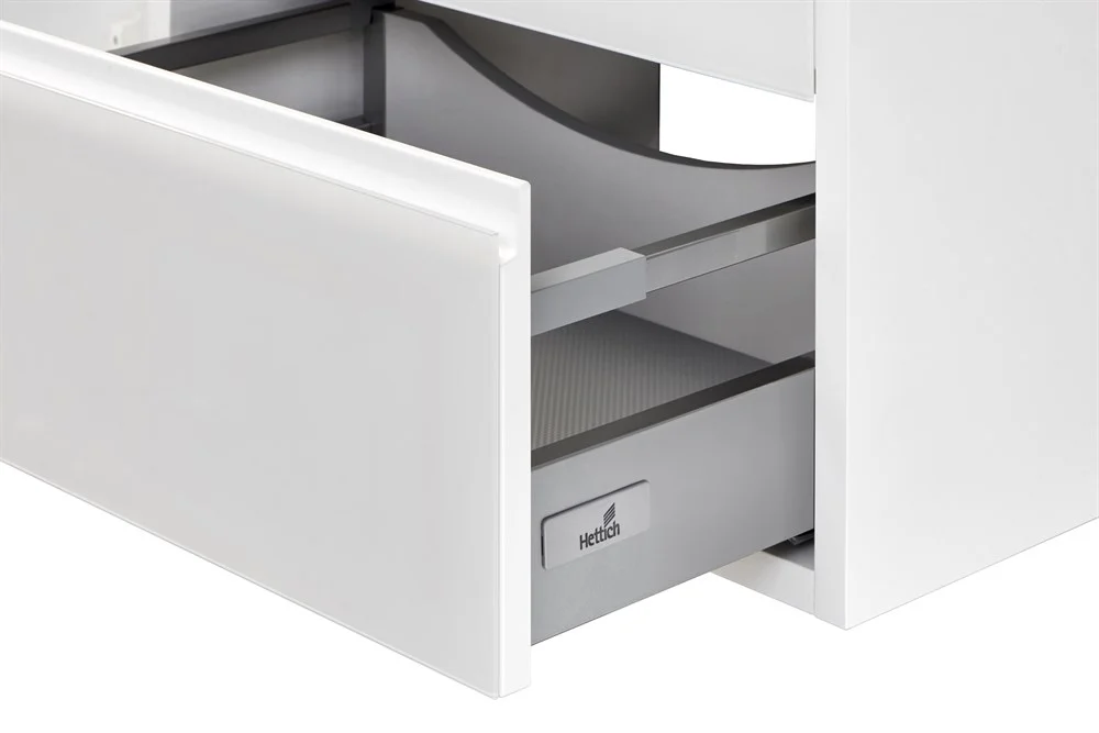 Лаконичная модель, созданная для тех, кто предпочитает строгий дизайн в безупречном исполнении. Поверхность фасадов удивляет элегантностью и безупречной ровностью. Этот эффект достигается благодаря стеклянным панелям, установленным на фасадах. В тумбе установлены два ящика, снабженные новейшей системой плавного закрывания. Нижний ящик предназначен для больших предметов, а верхний, имеющий удобную систему организации пространства, - для мелких аксессуаров. Тумба комплектуется удобной раковиной из литого мрамора, которая имеет глубокую чашу и выпускается в двух вариантах - для обычного слива или для механизма с донным клапаном. Шкаф можно, повернув его на 180 градусов, размещать как с левой, так и с правой стороны. На фасадах установлены большие зеркала, которые визуально расширяют пространство ванной комнаты. В зеркале за гравировкой установлена подсветка, которая управляется с помощью надежного датчика движения, что очень удобно во влажном помещении. Дополнительное преимущество зеркала - современная система п