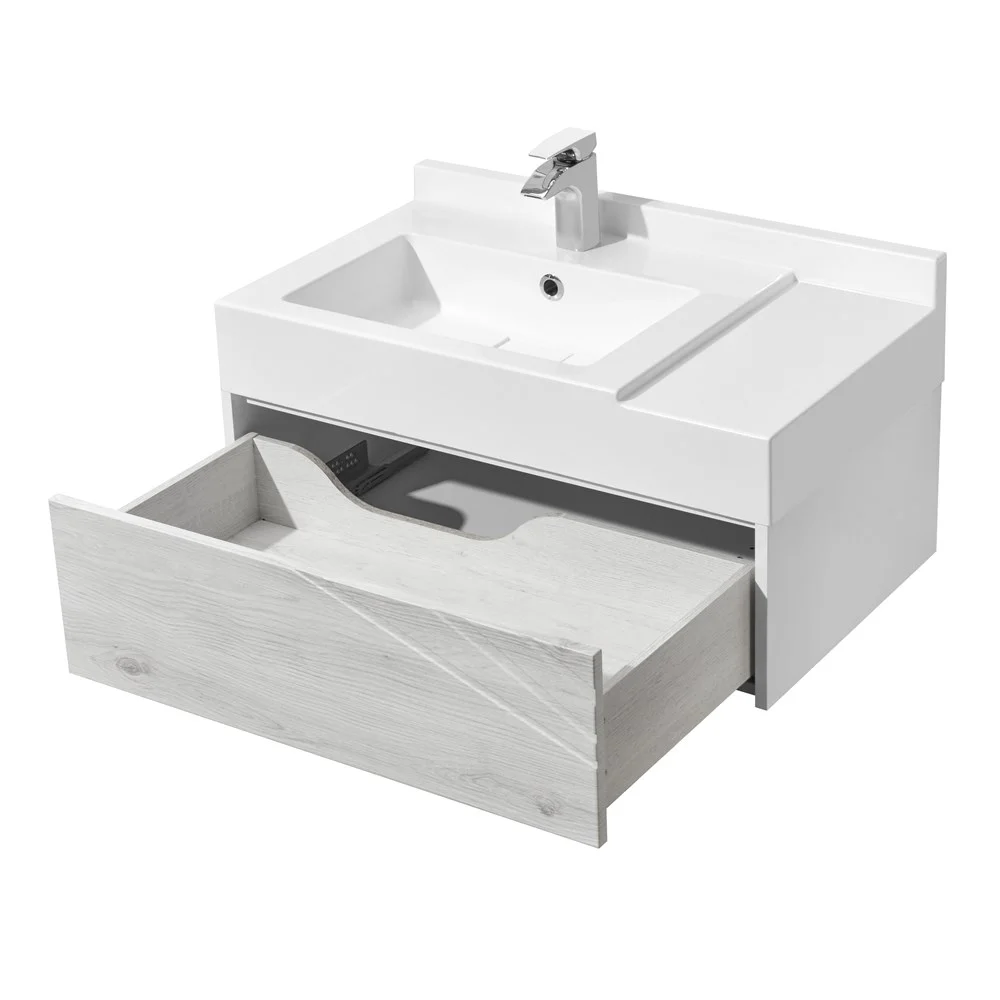 Тумба Сакура шириной 800 см снабжена одним вместительным ящиком полного выдвижения, установленным на бесшумные направляющие скрытого монтажа, оснащенного системой push-to-open. В ящике предусмотрен антискользящий коврик, препятствующий перемещению содержимого. Корпус тумбы выполнен из влагостойкой ЛДСП, окрашенной в белоснежный цвет с высокой степенью глянца полиэфирной краской ультрафиолетового отверждения. Фасады тумбы выполнены из высококачественной МДФ в пленке в древесной текстуре ольха наварра (производство Германия). Изящная фрезеровка на фасаде, напоминающая ветви дерева, придает особое очарование изделию. Удобная раковина Сакура из литого мрамора с крылом чуть ниже уровня чаши позволяет функционально использовать пространство для хранения принадлежностей для ванной комнаты.