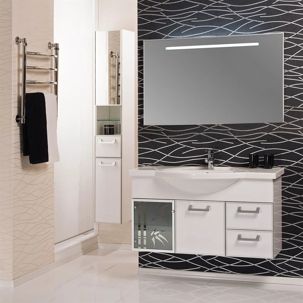 Модель с раковиной из литого мрамора. Фасады и зеркало окантованы алюминиевым профилем. В тумбе, за большими створками расположена полка, а справа - два ящика. Левый фасад украшен стеклом с зеркальным рисунком в виде бамбука.