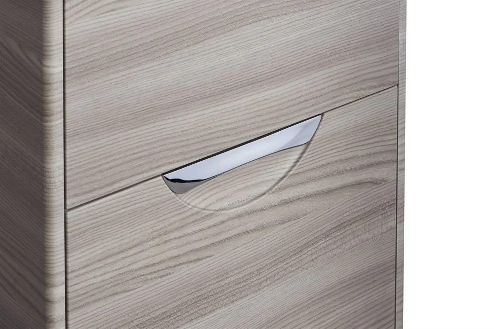 Подвесная колонна состоит из двух отделений и выдвижного ящика. Пространство верхнего отделения колонны организовано с помощью двух регулируемых полок, в нижнем отделении находится вместительная бельевая корзина. Выдвижные ящики на тумбе и колонны снабжены направляющими плавного выдвижения, которые бесшумны и комфортны в использовании, а изящная удобная врезная ручка гармонично дополняет дизайн. Укомплектованная прямоугольной керамической раковиной