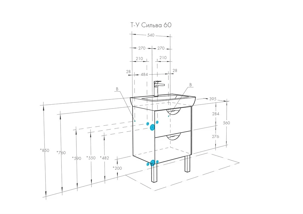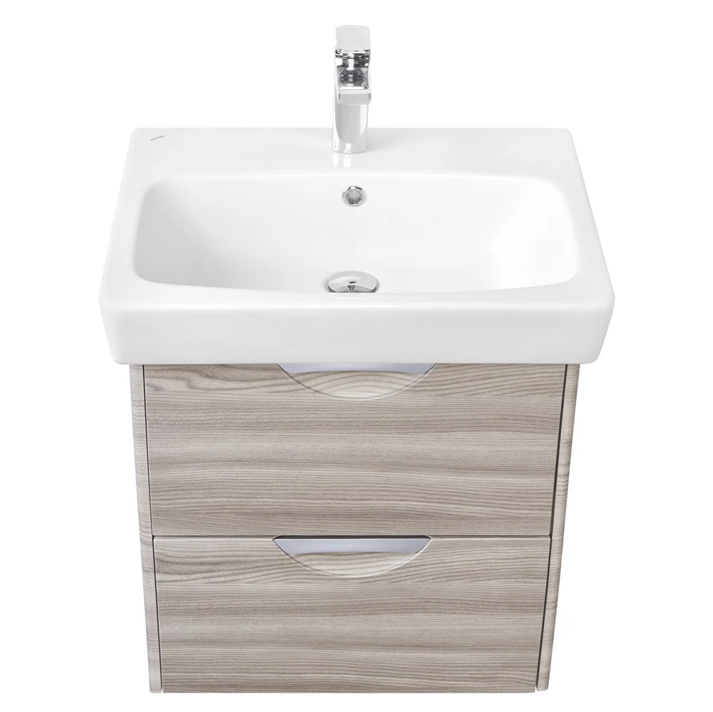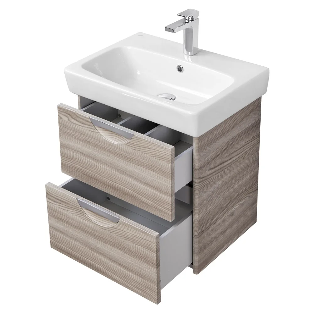 Подвесная колонна состоит из двух отделений и выдвижного ящика. Пространство верхнего отделения колонны организовано с помощью двух регулируемых полок, в нижнем отделении находится вместительная бельевая корзина. Выдвижные ящики на тумбе и колонны снабжены направляющими плавного выдвижения, которые бесшумны и комфортны в использовании, а изящная удобная врезная ручка гармонично дополняет дизайн. Укомплектованная прямоугольной керамической раковино