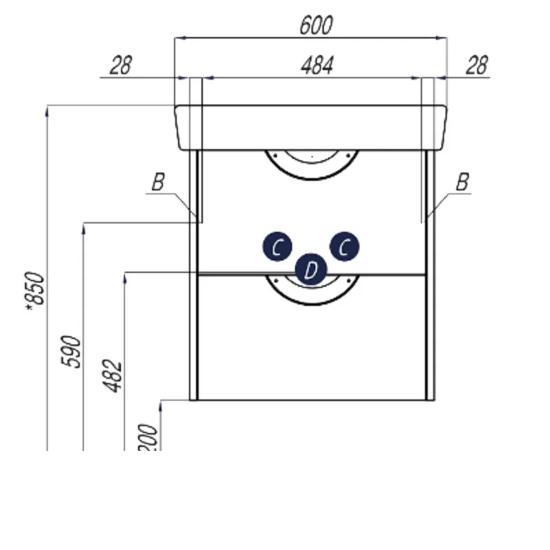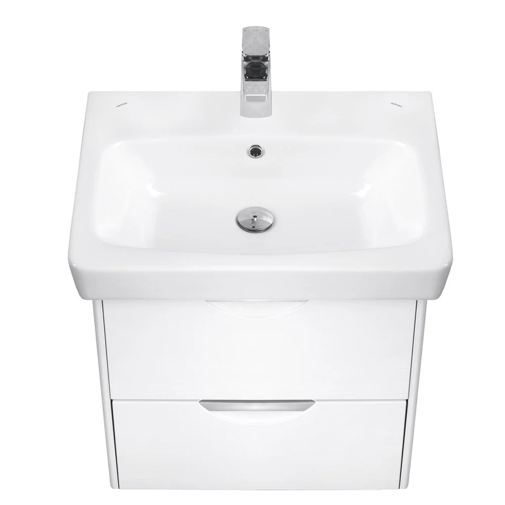 Подвесная колонна состоит из двух отделений и выдвижного ящика. Пространство верхнего отделения колонны организовано с помощью двух регулируемых полок, в нижнем отделении находится вместительная бельевая корзина. Выдвижные ящики на тумбе и колонны снабжены направляющими плавного выдвижения, которые бесшумны и комфортны в использовании, а изящная удобная врезная ручка гармонично дополняет дизайн. Укомплектованная прямоугольной керамической раковино