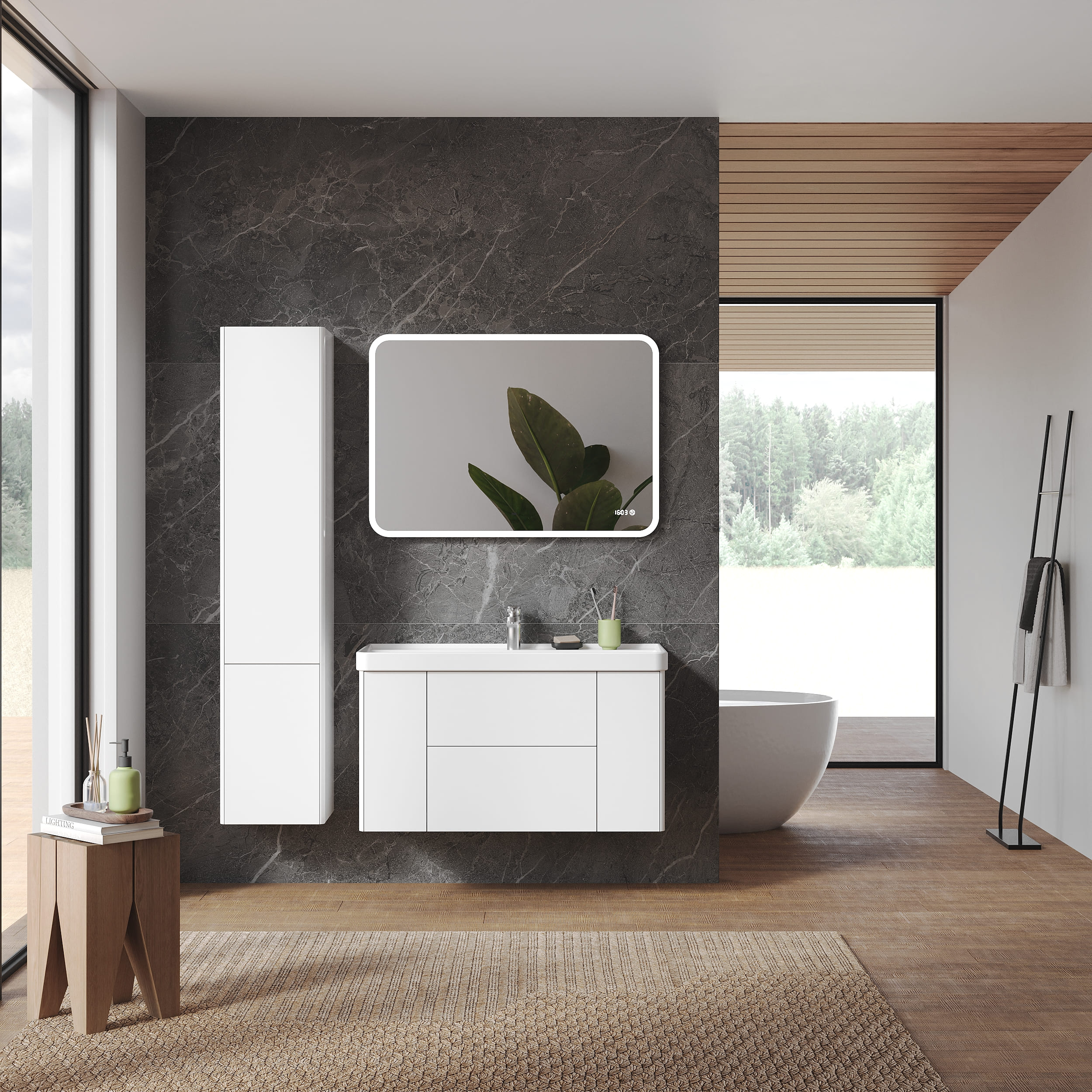 Корпус изготовлен из влагостойкого МДФ. Фасады выполнены из ЛДСП и покрыты итальянской эмалью (2 слоя эмали + 4 слоя грунта). Комплектуется фурнитурой Hettich с системой бесфурнитурного открывания push-to-open. Внутренняя отделка ящиков с текстурой дуб Веллингтон Табак. В комплект входит умывальник модели "Бьюти".