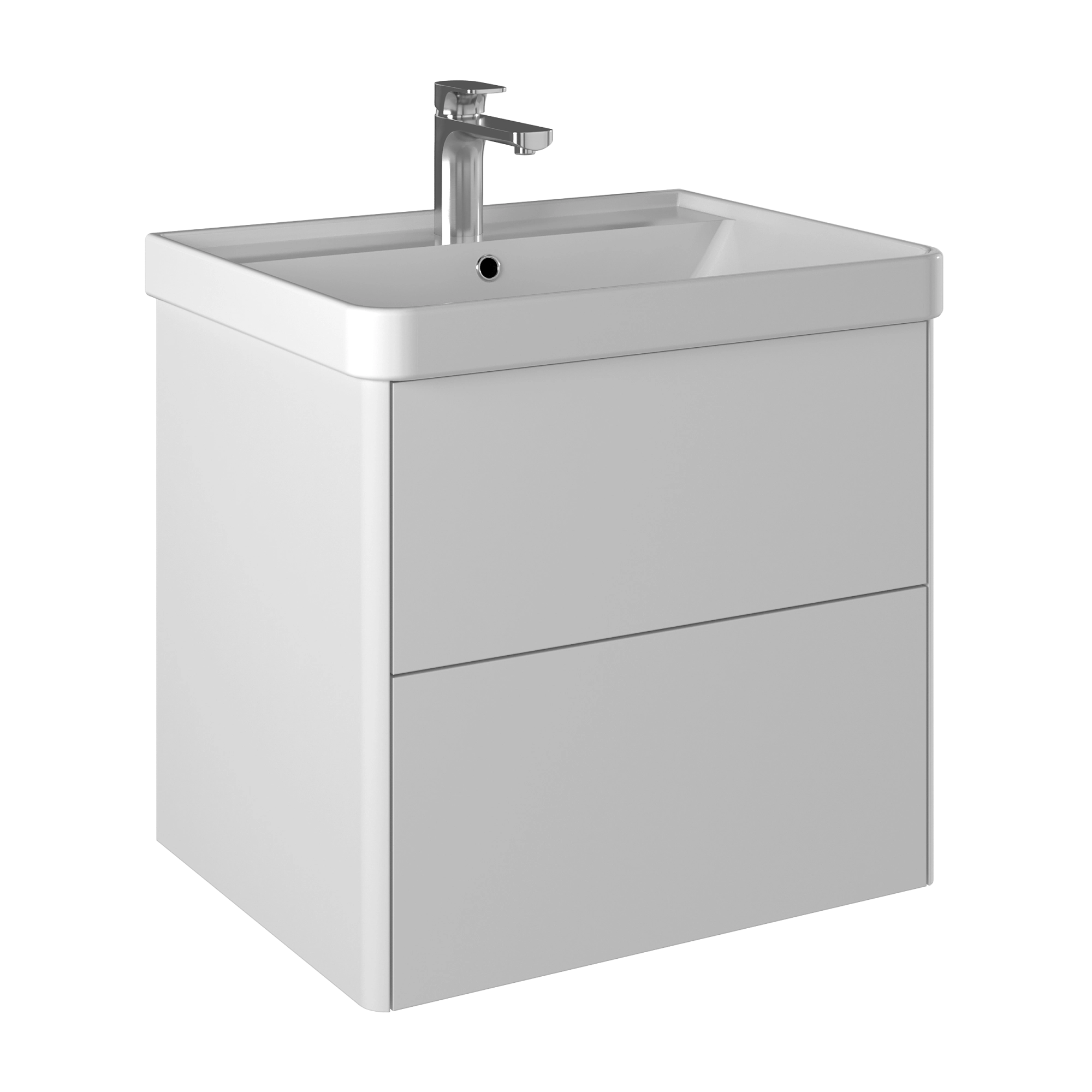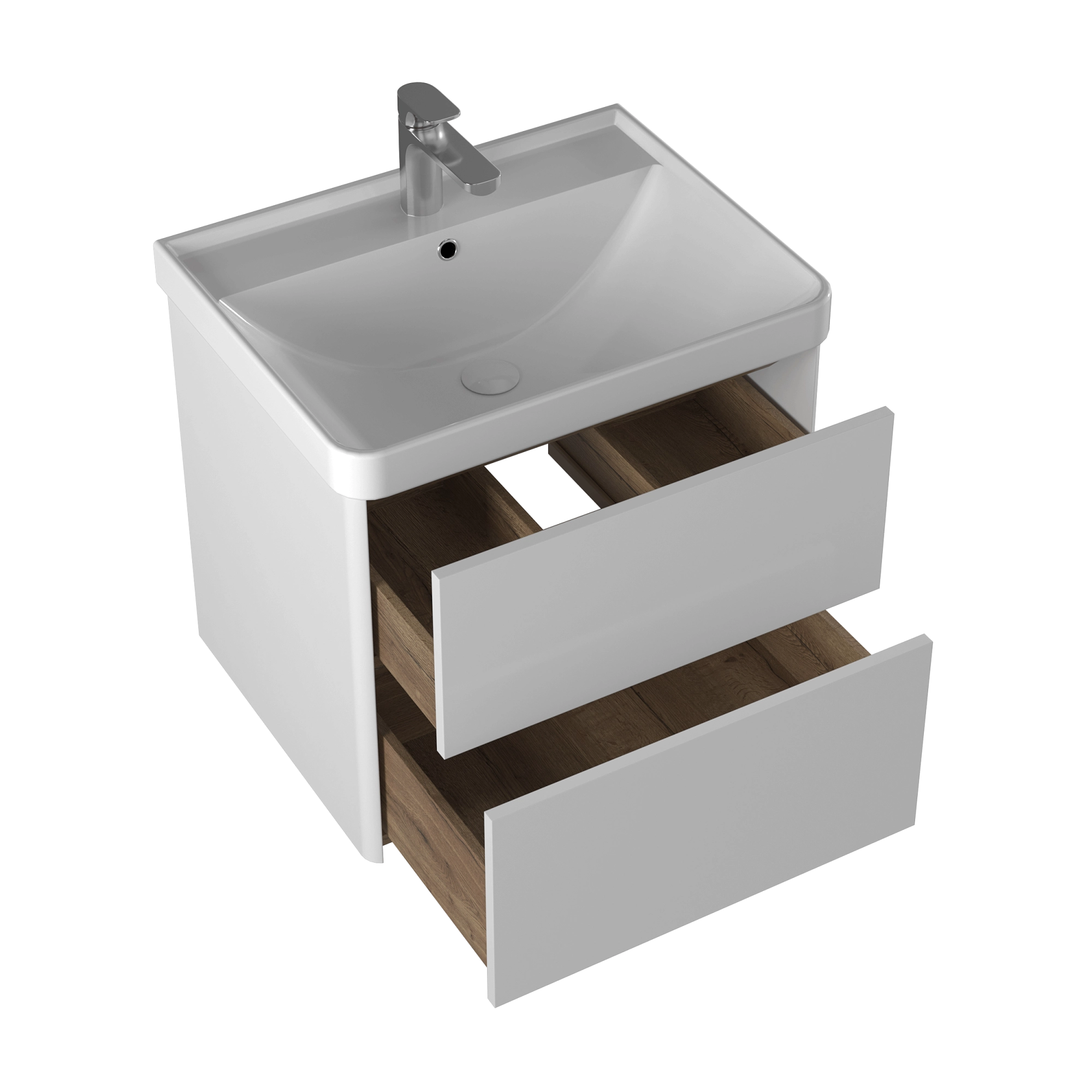Корпус изготовлен из влагостойкого МДФ. Фасады выполнены из ЛДСП и покрыты итальянской эмалью (2 слоя эмали + 4 слоя грунта). Комплектуется фурнитурой Hettich с системой бесфурнитурного открывания push-to-open. Внутренняя отделка ящиков с текстурой дуб Веллингтон Табак. В комплект входит умывальник модели "Бьюти".