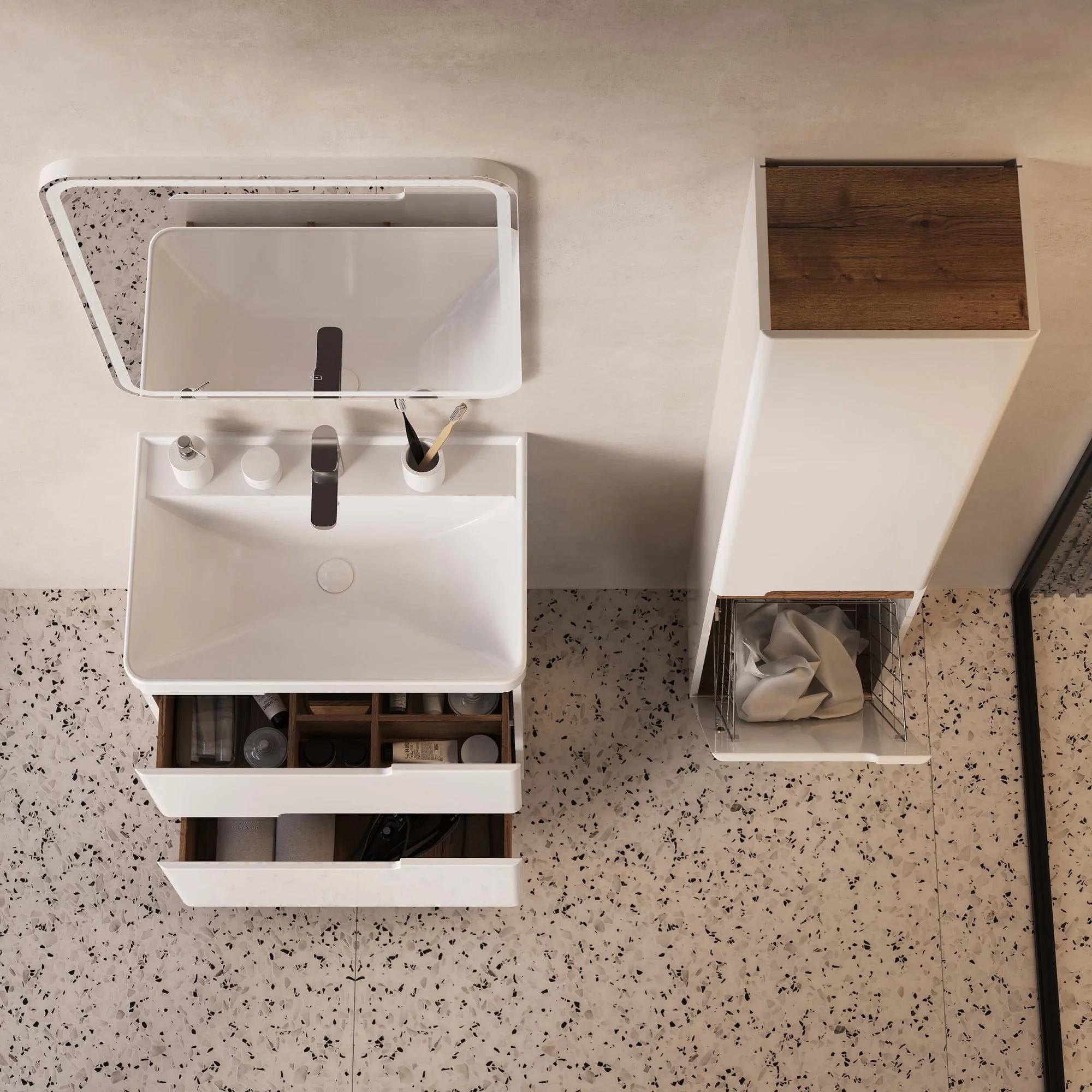 Корпус изготовлен из влагостойкого МДФ. Фасады выполнены из ЛДСП и покрыты итальянской эмалью (2 слоя эмали + 4 слоя грунта). Комплектуется фурнитурой Hettich с системой бесфурнитурного открывания push-to-open. Внутренняя отделка ящиков с текстурой дуб Веллингтон Табак. В комплект входит умывальник модели "Бьюти