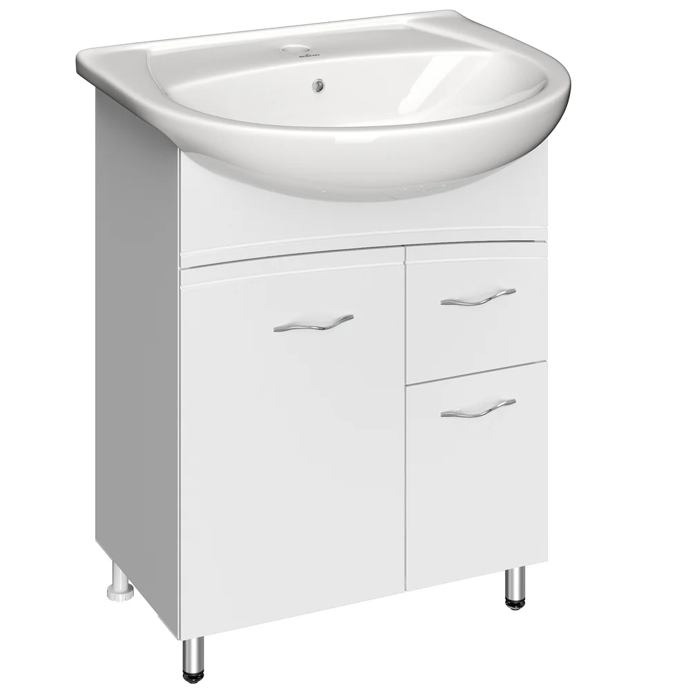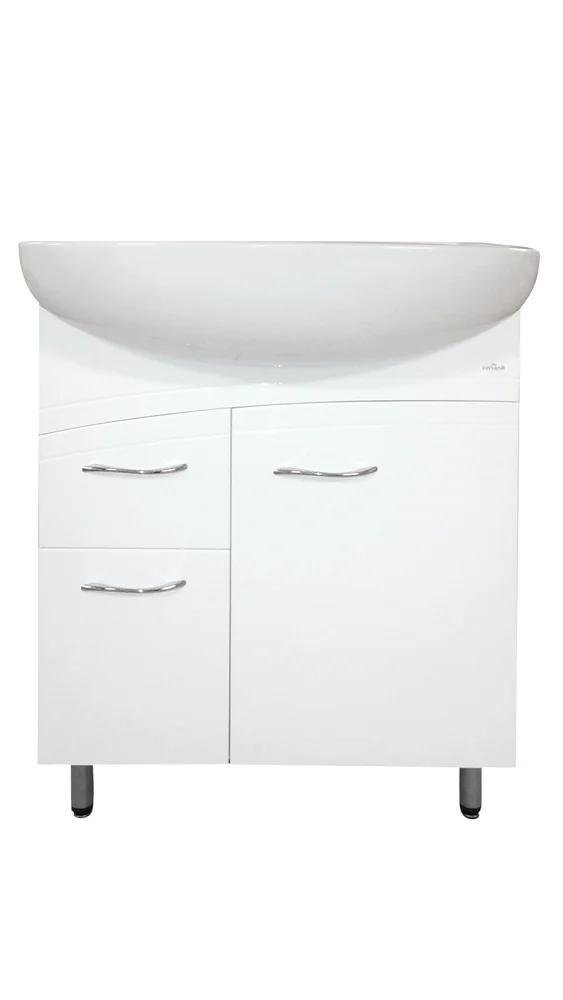 Простая и лаконичная тумба под раковину с двумя дверцами и ящиком полного выдвижения хорошо впишется в любую ванную комнату. Тумба выдерживает воздействие влаги и образования конденсата. Дверцы и ящики тумбы снабжены доводчиками, что обеспечивает планове и бесшумное закрытие.