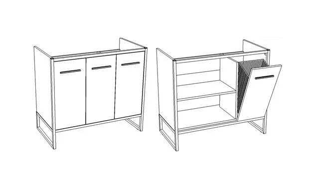 Коллекция выполнена в актуальном стиле "Лофт". Тумба закреплена на металлическом каркасе. У тумбы 2 распашные двери. 3-я дверь - откидная с корзиной для белья.