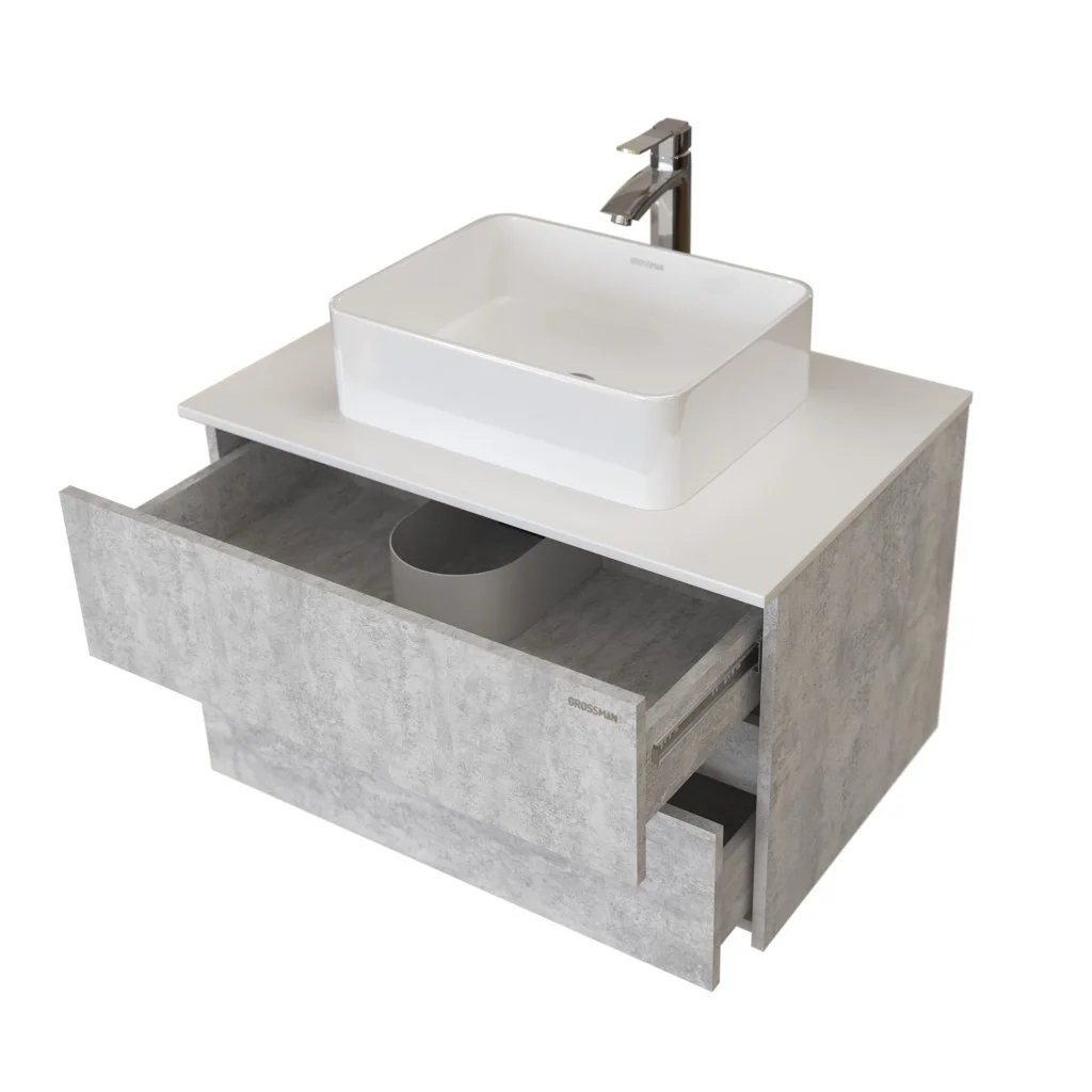 Тумба подвесная Эдванс 80 см отражает современные тенденции в дизайне мебели для ванных комнат: и создана для тех, кто ценит современный лаконичный дизайн, холодный эффект светлого цемента.