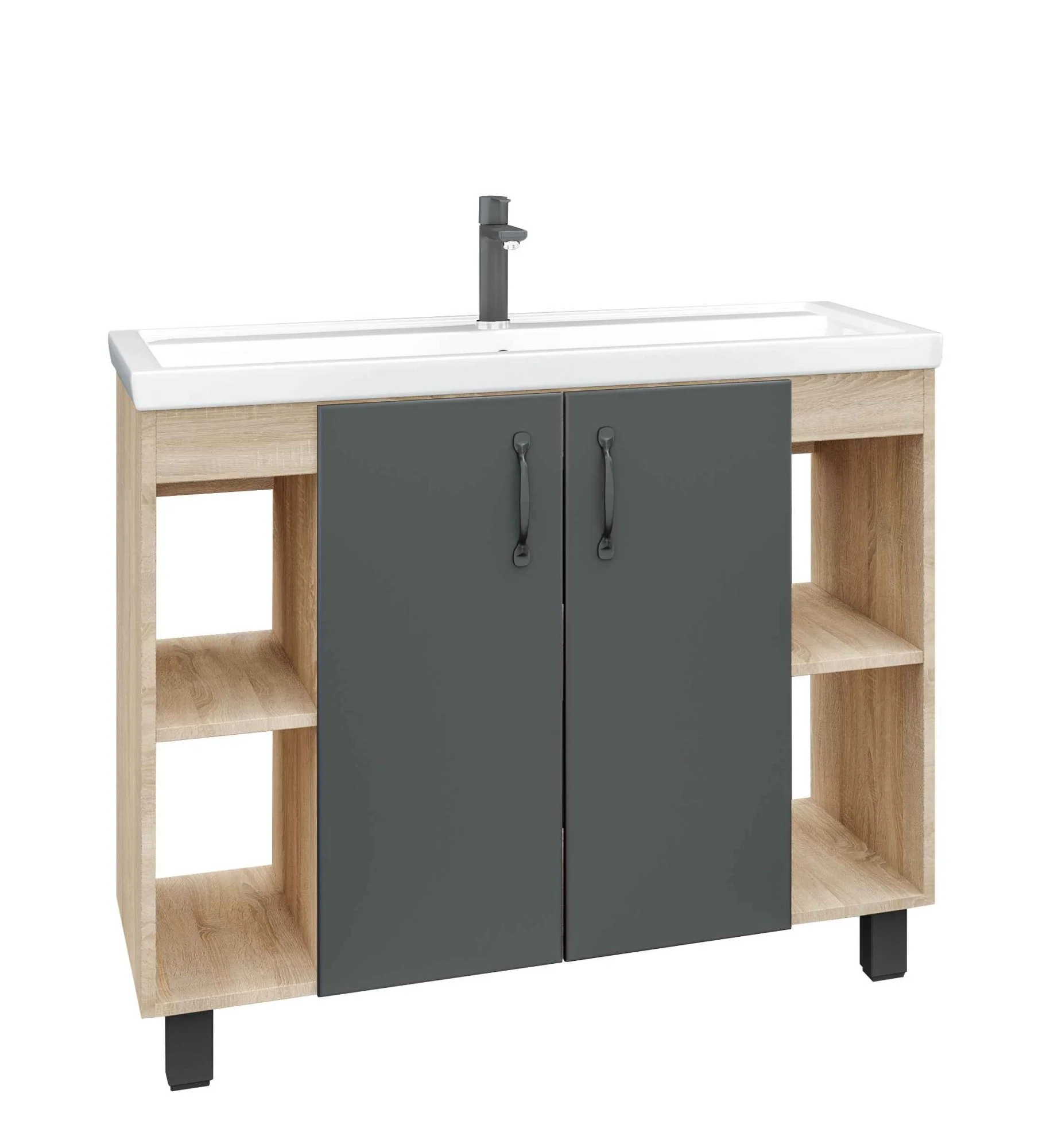 В тумбе Флай 100 см сочетаются контрастные цвета и фактуры: серый матовый фасад с покрытием SoftTouch, корпус цвета дуба с текстурой, черная матовая фурнитура.