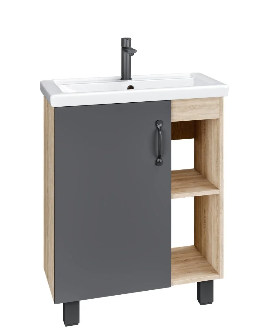 В тумбе Флай 60 см сочетаются контрастные цвета и фактуры: серый матовый фасад с покрытием SoftTouch, корпус цвета дуба с текстурой, черная матовая фурнитура.