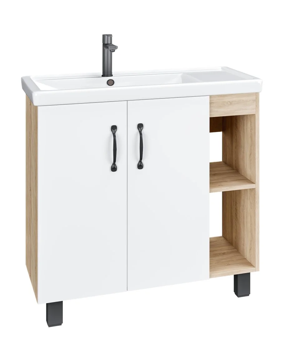В тумбе Флай 80 см сочетаются контрастные цвета и фактуры: белый матовый фасад с покрытием SoftTouch, корпус цвета дуба с текстурой, черная матовая фурнитура.